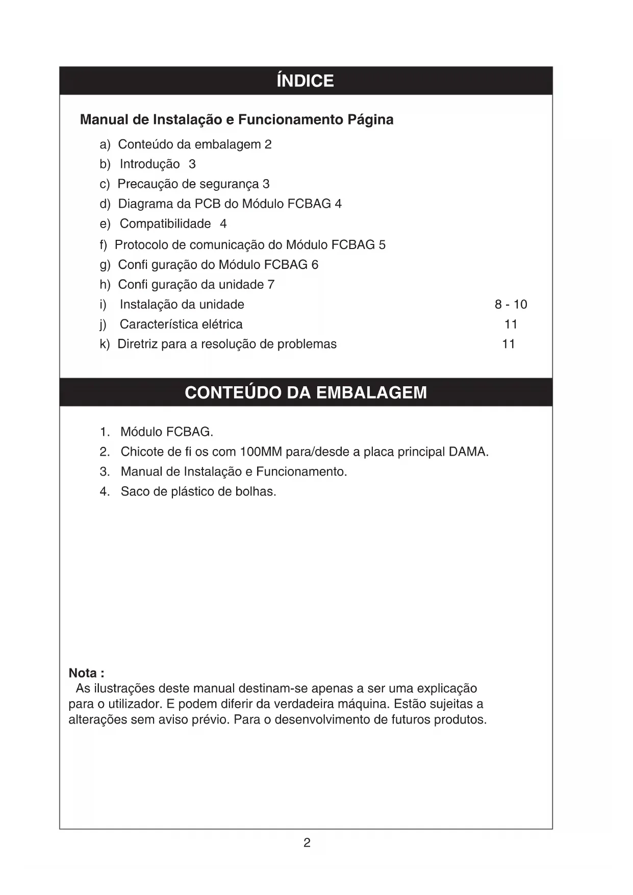 Αναβοσβήνει Δεν αναβοσβήνει Βεβαιωθείτε ότι μόνο ο διακόπτης dip αρ. "Ε" είναι ΕΝΕΡΓΟΠΟΙΗΜΕΝΟΣ για τη λειτουργία MODBUS. ** Ανατρέξτε στη διάταξη της μονάδας FCBAG για τη θέση της λυχνίας LED. IOM_FCBAG MODULE_3P764166-1-KC_EN+ML.indb 11IOM_FCBAG MODULE_3P764166-1-KC_EN+ML.indb 11 18/10/2024 2:00:18 PM18/10/2024 2:00:18 PM2 Nota : As ilustrações deste manual destinam-se apenas a ser uma explicação para o utilizador. E podem diferir da verdadeira máquina. Estão sujeitas a alterações sem aviso prévio. Para o desenvolvimento de futuros produtos. ÍNDICE Manual de Instalação e Funcionamento Página a) Conteúdo da embalagem 2 b) Introdução 3 c) Precaução de segurança 3 d) Diagrama da PCB do Módulo FCBAG 4 e) Compatibilidade 4 f) Protocolo de comunicação do Módulo FCBAG 5 g) Confi guração do Módulo FCBAG 6 h) Confi guração da unidade 7