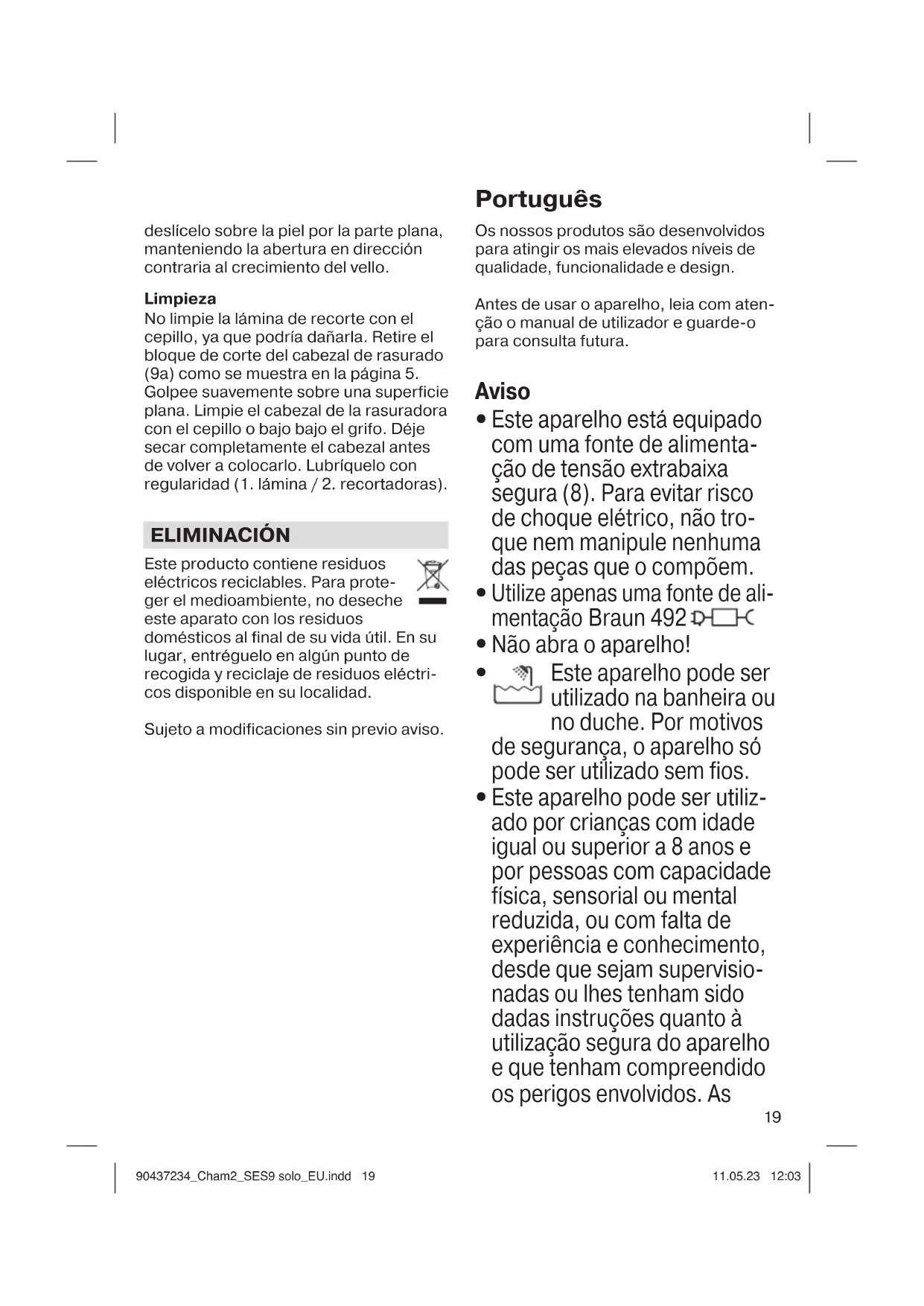 - A esfoliação evita o aparecimento de pelos encravados e proporciona as condições ideais para a depilação. Como depilar Certifique-se de que a cabeça de depila- ção (2) está limpa. Consoante o modelo, utilize um dos seguintes acessórios: Acessório de rolo de massagem (1a): para o máximo conforto Acessório para maior contacto com a pele (1b): para uma maior eficiência Utilização em seco: A sua pele deve estar seca e sem gordura ou creme. Utilização em molhado: Certifique-se de que a sua pele está bem molhada para ter as condições ideais de deslizamento. Estique sempre a pele durante a depila- ção. Deslize o aparelho, num movimento lento e contínuo, sem pressionar, na direção contrária à do crescimento do pelo e em direção à luz. Pernas: Ao depilar os pelos por trás do joelho, mantenha a perna esticada e direita. Zonas sensíveis: Primeiro limpe bem e seque cuidadosa- mente as zonas sensíveis para remover quaisquer resíduos (como desodori- zante). Quando depilar as axilas, mante- nha o seu braço elevado, para que a pele fique esticada, e deslize o aparelho em várias direções. Como a pele pode ficar mais sensível depois da depilação, evite utilizar substâncias irritantes, como os desodorizantes com álcool. Limpeza da cabeça da depiladora Após a utilização, desligue o aparelho e limpe a cabeça da depiladora: Retire o acessório (1a/b). Escove as pin- ças enquanto gira o elemento de pinças manualmente. Pressione o botão de libertação (7) para remover a cabeça de depilação. Bata suavemente na mesma para remover os pelos do interior. Se for necessária uma limpeza rigorosa, pode colocar o aparelho com a cabeça facial sob água corrente quente. Em seguida, retire a cabeça da depiladora e sacuda-a para retirar o excesso de água. Confirme que está seca antes de voltar a colocá-la. Informações gerais sobre depilação Todos os métodos de remoção dos pelos pela raiz podem levar ao aparecimento de 90437234_Cham2_SES9 solo_EU.indd 2190437234_Cham2_SES9 solo_EU.indd 21 11.05.23 12:0311.05.23 12:0322 irritações na pele (por exemplo, comi- chão, desconforto e vermelhidão), dependendo do estado da pele e dos pelos. Trata-se de uma reação normal que deverá desaparecer rapidamente, mas que poderá ser mais acentuada quando são as primeiras vezes que se remo vem pelos pela raiz ou quando se tem a pele sensível. Em geral, as reações cutâneas e a sensa- ção de desconforto tendem a diminuir consideravelmente com a utilização repe- tida do aparelho. Se, passadas 36 horas, a pele ainda apresentar irritação, reco- mendamos que contacte o seu médico. Para minimizar o risco de infeção ou inflamação devido a bactérias que poderiam penetrar na pele quando tem alguma microlesão, limpe bem a cabeça da depiladora e a sua pele antes de cada utilização. Se tiver alguma dúvida sobre a utilização deste aparelho, consulte previamente o seu médico. Só deverá utilizar este apa- relho, depois de consultar o seu médico, em caso de: eczema, feridas, reações inflamatórias da pele, tais como foliculite (inflamação purulenta dos folículos pilo- sos) e varizes, em torno de sinais ou ver- rugas, imunidade reduzida da pele, por exemplo, diabetes mellitus, durante a gravidez, doença de Raynaud, hemofilia, cândida ou deficiência imunitária. Rapar os pelos (B) A cabeça de corte (9) foi desenhada para um corte rápido e rente nas pernas, axilas e zona do biquíni. Rape com a pele seca para obter uns melhores resul- tados. Para aparar os pelos até 3 mm de com- primento, fixe o pente aparador (9b) e deslize-o de forma plana sobre a pele, com a abertura em direção contrária ao crescimento do pelo. Limpeza Não limpe a lâmina de corte com a escova, pois ao fazê-lo pode-se danifi- car. Remova bloco de corte da cabeça de corte (11) conforme mostrado na página 5. Bata ao de leve com o bloco de corte numa superfície plana. Limpe a cabeça da depiladora com a escova ou com água corrente. Depois de limpar, volte a fixar a cabeça apenas em condi- ções secas. Lubrifique regularmente (1. lâmina / 2. aparadores). ELIMINAÇÃO Este produto contém baterias e resíduos elétricos recicláveis. Para proteger o ambiente, não o elimine com o lixo doméstico, leve-o para os pontos locais de recolha ou reciclagem previstos para esse fim. Sujeito a alterações sem aviso prévio. 90437234_Cham2_SES9 solo_EU.indd 2290437234_Cham2_SES9 solo_EU.indd 22 11.05.23 12:0311.05.23 12:0323 I nostri prodotti sono studiati per rispon- dere a elevati standard di qualità, funzio- nalità e design. Leggere attentamente le istruzioni prima di utilizzare l’apparecchio e conservarle per una consultazione futura. Avvertenza