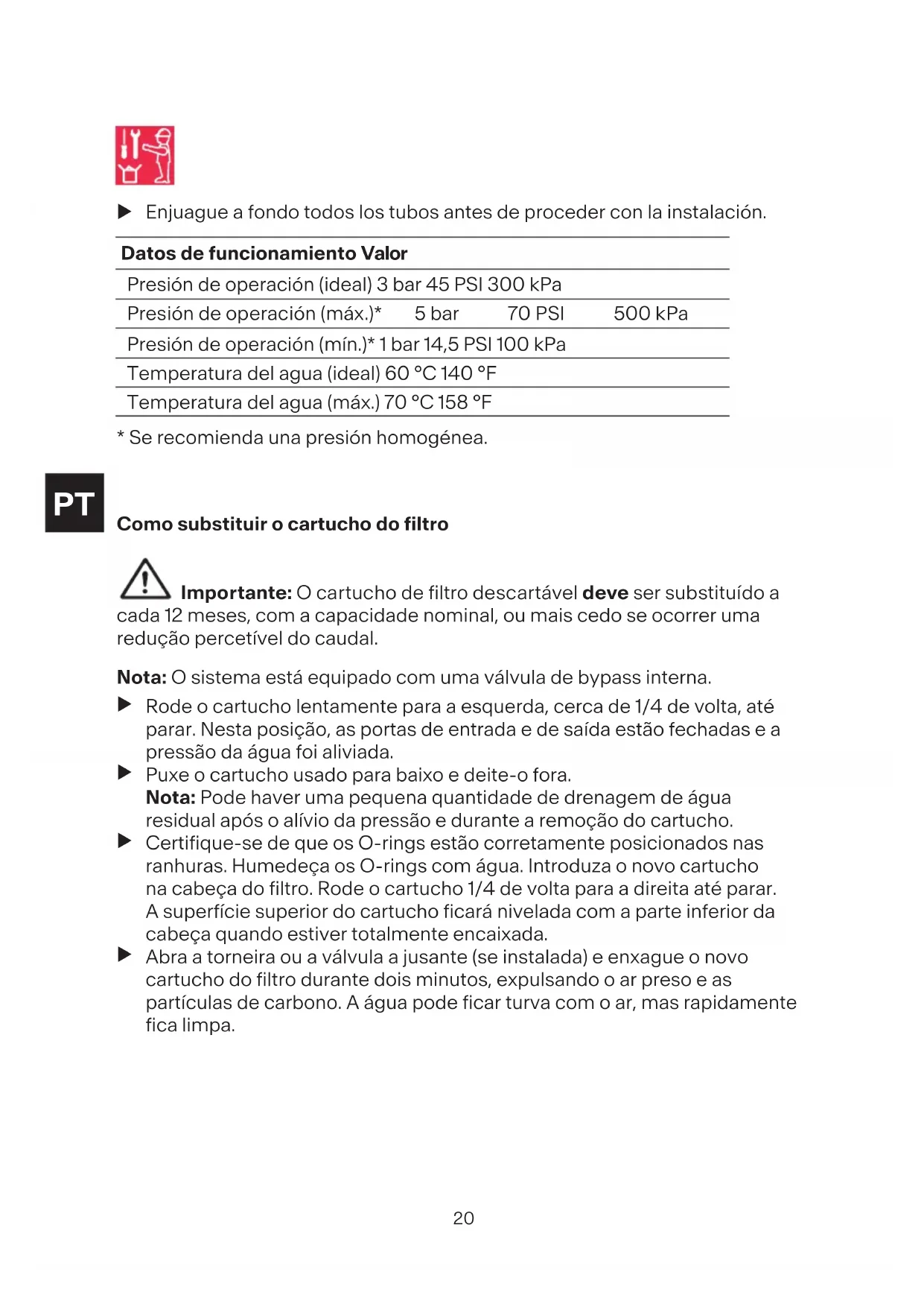 - Se recomienda una presión homogénea. Como substituir o cartucho do ltro Importante: O cartucho de ltro descartável deve ser substituído a cada 12 meses, com a capacidade nominal, ou mais cedo se ocorrer uma redução percetível do caudal. Nota: O sistema está equipado com uma válvula de bypass interna.