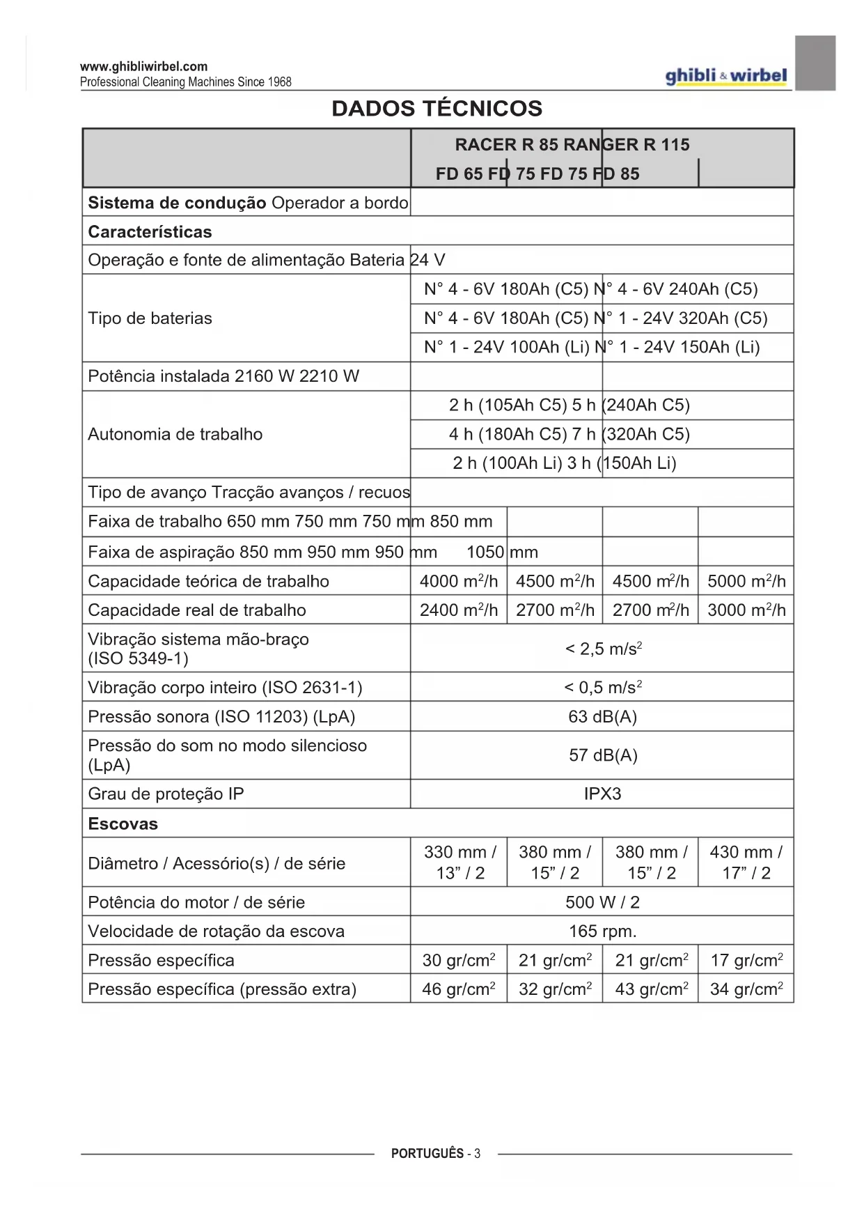 RANGER R 115 FD 85 BC CHEM - Limpador de chão Ghibli & Wirbel - Manual de utilização gratuito