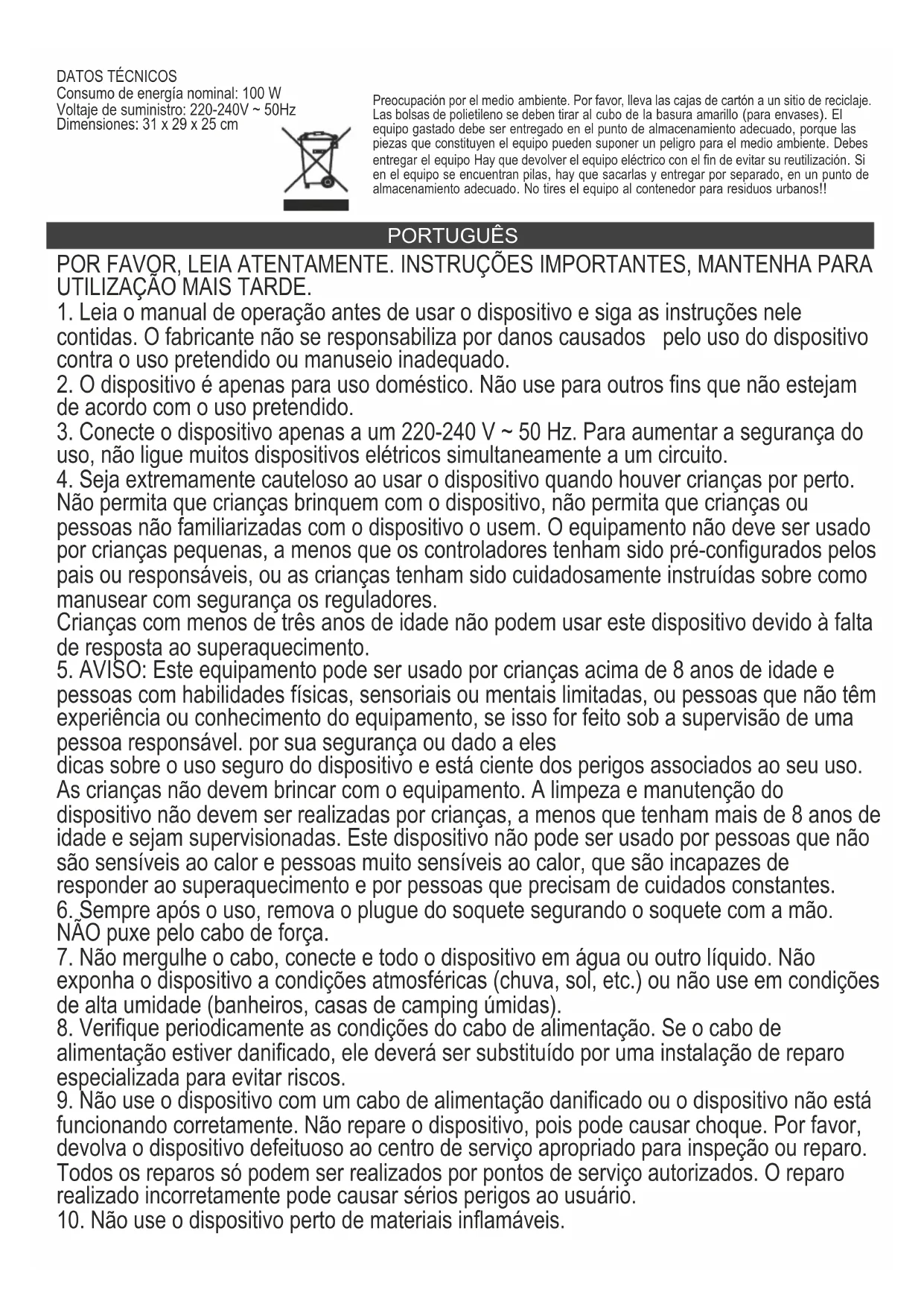 Consumo de energia nominal: 100W Tensão de alimentação: 220-240V ~ 50Hz Dimensões: 31 x 29 x 25 cm Protecção do meio ambiente. Rogamos, os embalagens de cartão destinem-se para papéis velhos. Os sacos de polietileno (PE) devem-se colocar em contenedores para material plástico. O dispositivo usado deve-se levar a um ponto de armazenamento adequado porque os componentes perigosos que ficam dentro do dispositivo podem ser perigosos para o meio ambiente. O dispositivo elétrico deve-se entregar de modo que se reduza a sua nova utilização e uso. Se no dispositivo há pilhas, devem-se tirar e levar a um ponto de armazenamento em separado. Não colocar o dispositivo em contenedores para resíduos municipais!! LIETUVIŲ PRAŠYKITE ATSARGIAI. SVARBIOS INSTRUKCIJOS, LAIKYKITE NAUDOTI VĖLIAU.