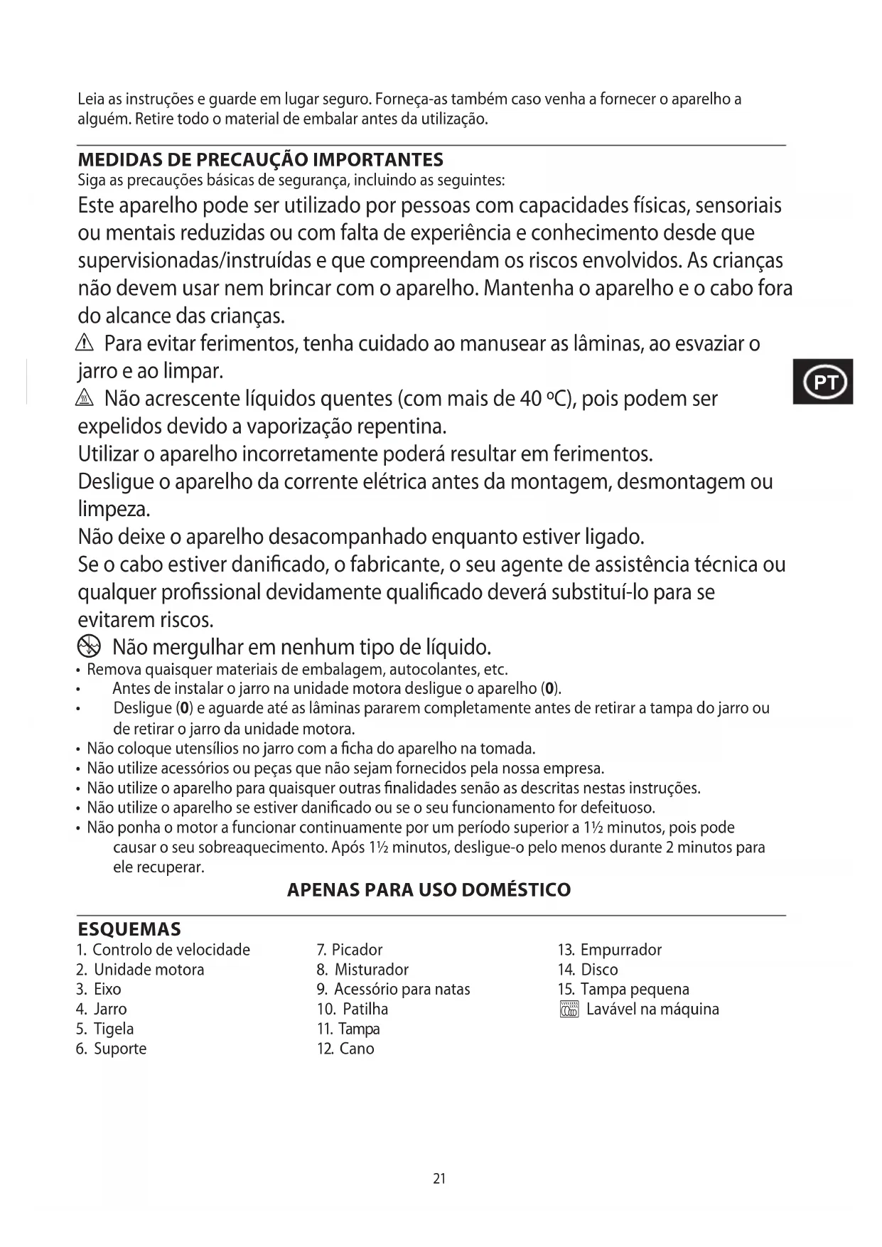 Siga as precauções básicas de segurança, incluindo as seguintes: Este aparelho pode ser utilizado por pessoas com capacidades físicas, sensoriais ou mentais reduzidas ou com falta de experiência e conhecimento desde que supervisionadas/instruídas e que compreendam os riscos envolvidos. As crianças não devem usar nem brincar com o aparelho. Mantenha o aparelho e o cabo fora do alcance das crianças. c Para evitar ferimentos, tenha cuidado ao manusear as lâminas, ao esvaziar o jarro e ao limpar. h Não acrescente líquidos quentes (com mais de 40 ºC), pois podem ser expelidos devido a vaporização repentina. Utilizar o aparelho incorretamente poderá resultar em ferimentos. Desligue o aparelho da corrente elétrica antes da montagem, desmontagem ou limpeza. Não deixe o aparelho desacompanhado enquanto estiver ligado. Se o cabo estiver danificado, o fabricante, o seu agente de assistência técnica ou qualquer profissional devidamente qualificado deverá substituí-lo para se evitarem riscos.