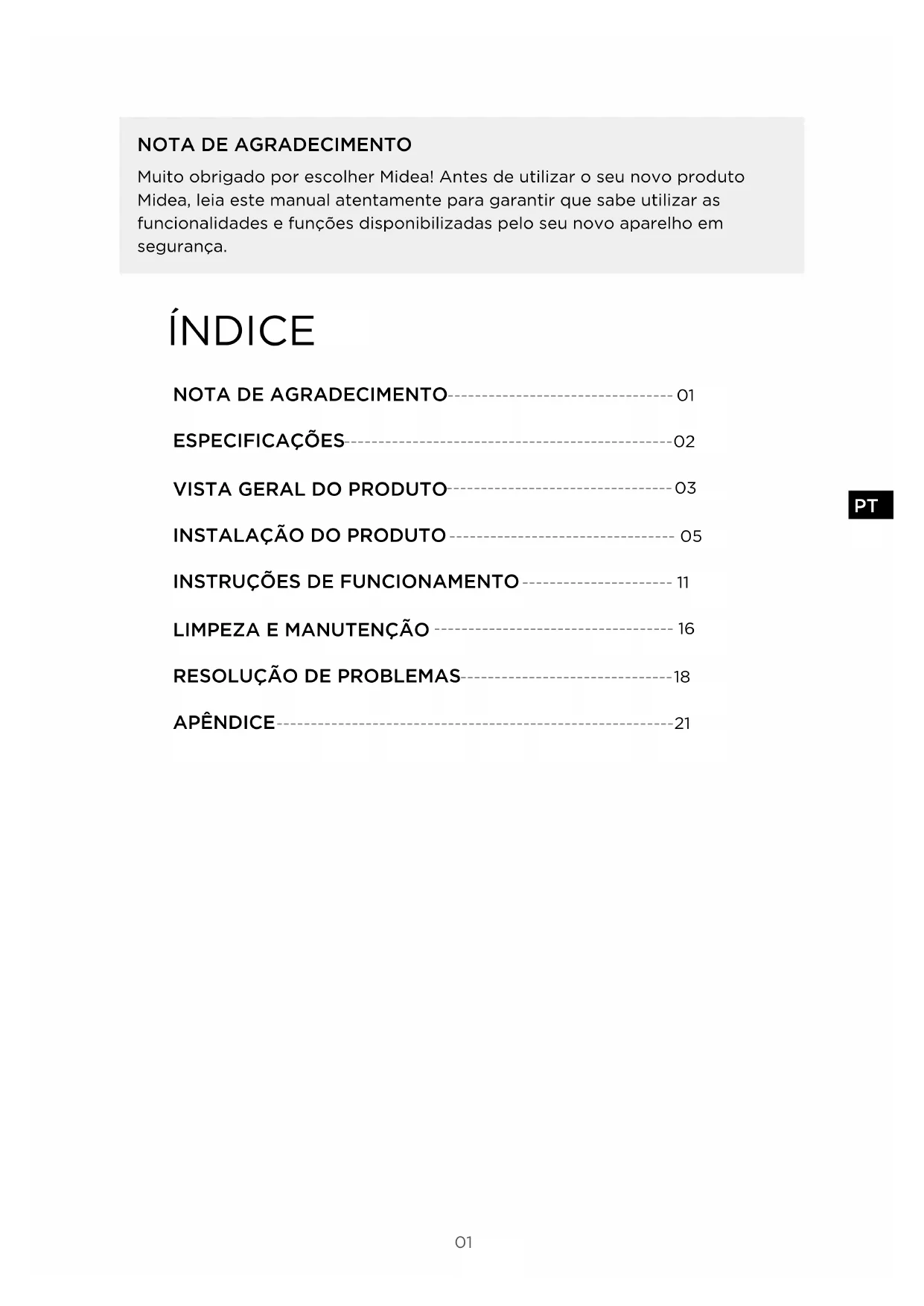 Muito obrigado por escolher Midea! Antes de utilizar o seu novo produto Midea, leia este manual atentamente para garantir que sabe utilizar as funcionalidades e funções disponibilizadas pelo seu novo aparelho em segurança. ÍNDICE