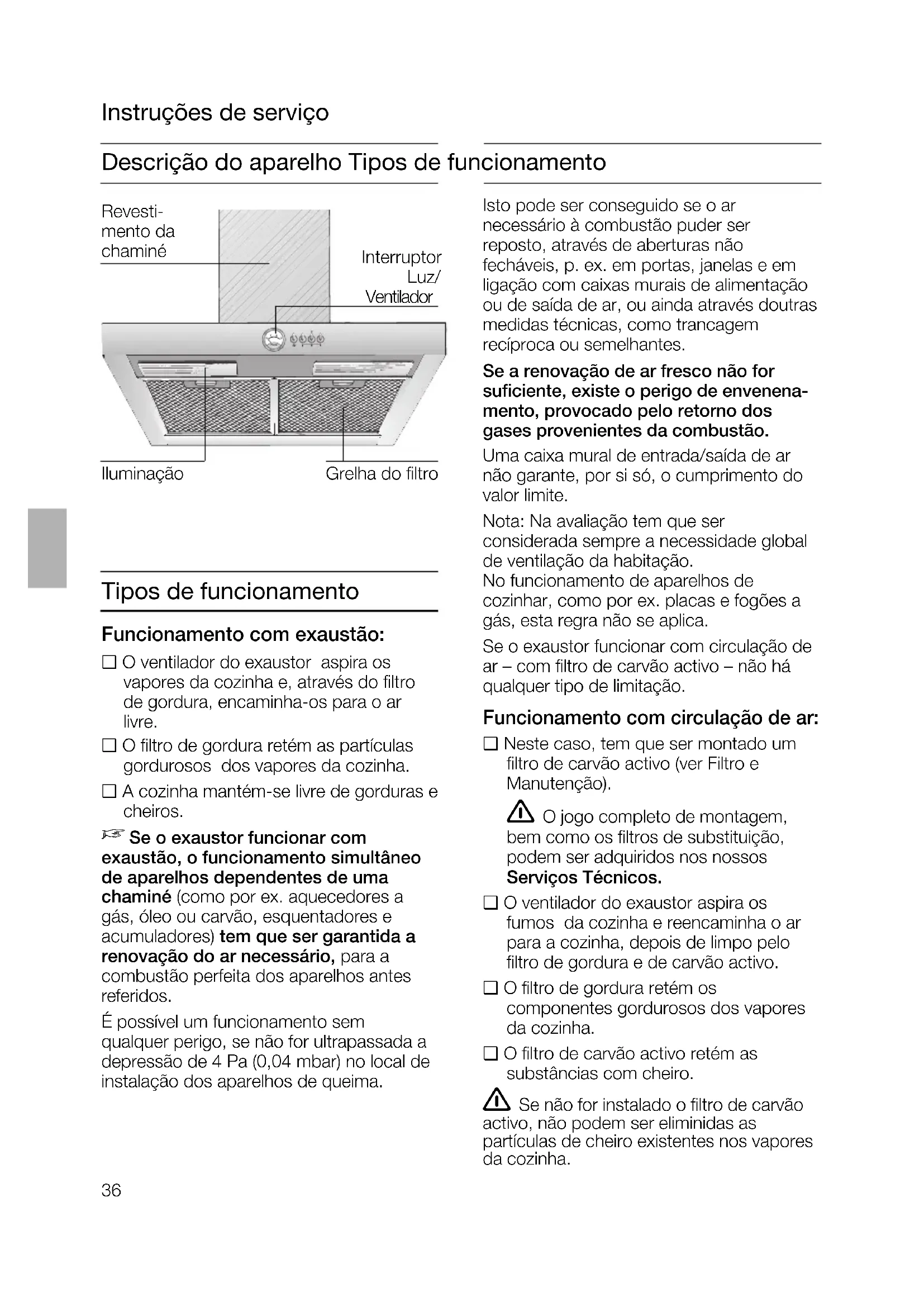 la notice d'utilisation).36 Descrição do aparelho Tipos de funcionamento Tipos de funcionamento Funcionamento com exaustão: ❑ O ventilador do exaustor aspira os vapores da cozinha e, através do filtro de gordura, encaminha-os para o ar livre. ❑ O filtro de gordura retém as partículas gordurosos dos vapores da cozinha. ❑ A cozinha mantém-se livre de gorduras e cheiros.
