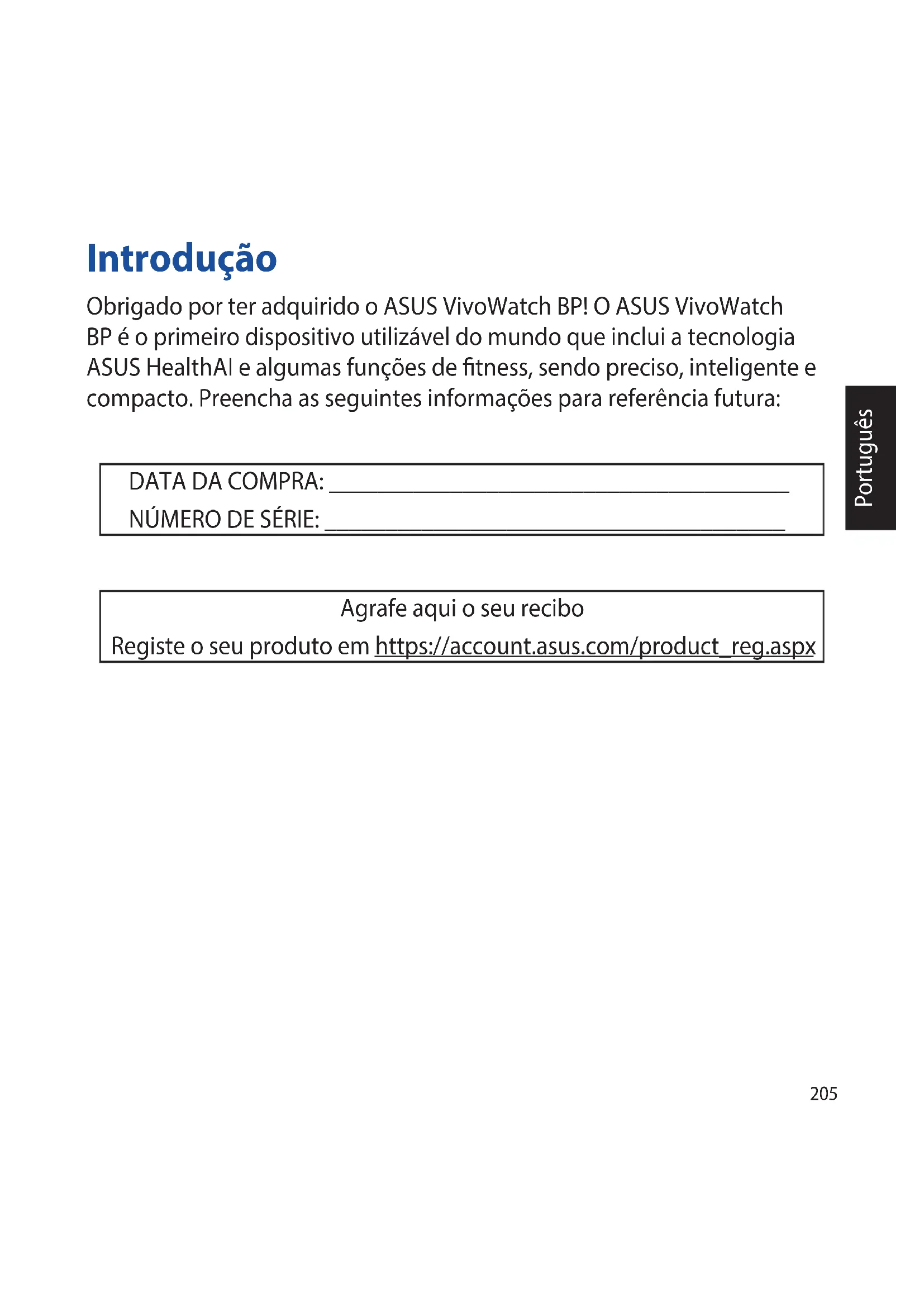 parte inferior derecha. Aparecerá un mensaje emergente cuando se complete la actualización del rmware.205 Português Introdução Obrigado por ter adquirido o ASUS VivoWatch BP! O ASUS VivoWatch BP é o primeiro dispositivo utilizável do mundo que inclui a tecnologia ASUS HealthAI e algumas funções de tness, sendo preciso, inteligente e compacto. Preencha as seguintes informações para referência futura: