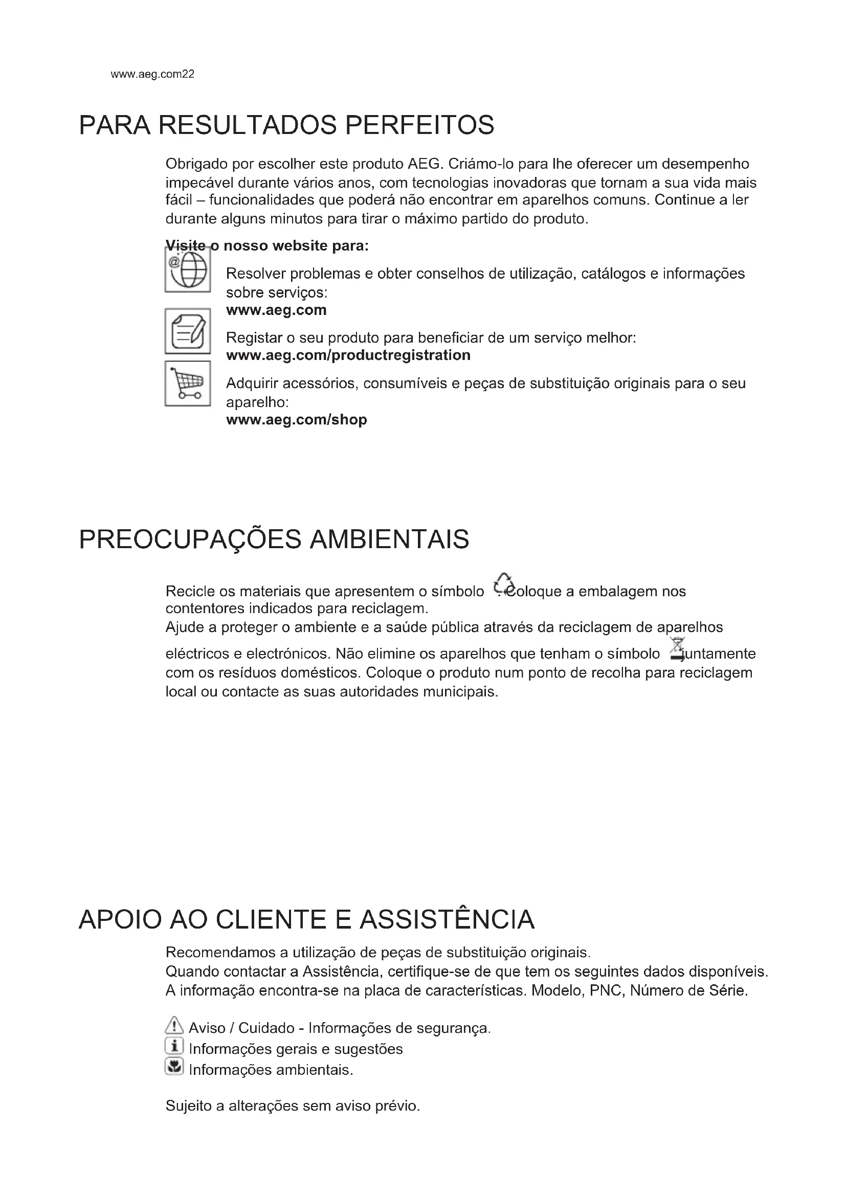 Obrigado por escolher este produto AEG. Criámo-lo para lhe oferecer um desempenho impecável durante vários anos, com tecnologias inovadoras que tornam a sua vida mais fácil – funcionalidades que poderá não encontrar em aparelhos comuns. Continue a ler durante alguns minutos para tirar o máximo partido do produto. Visite o nosso website para: Resolver problemas e obter conselhos de utilização, catálogos e informações sobre serviços: www.aeg.com Registar o seu produto para beneficiar de um serviço melhor: www.aeg.com/productregistration Adquirir acessórios, consumíveis e peças de substituição originais para o seu aparelho: www.aeg.com/shop