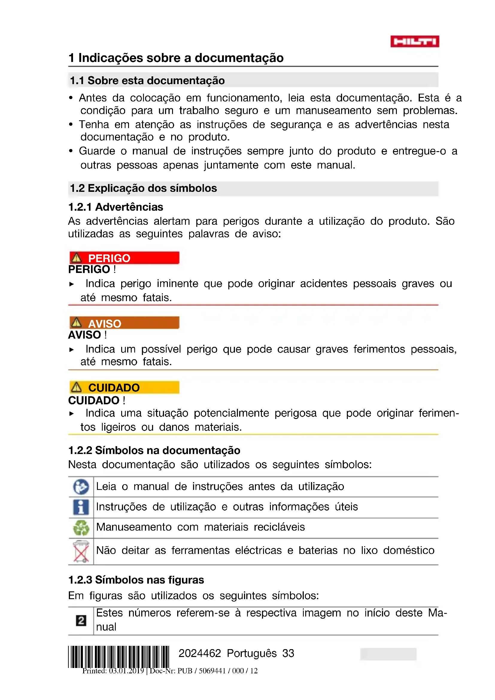 - Após os trabalhos de conservação e manutenção, aplicar todos os dispositivos de protecção e verificar o respectivo funcionamento. Para um funcionamento seguro, utilize apenas peças sobresselentes e consumíveis originais. Poderá encontrar peças sobresselentes, consumíveis e acessórios aprovados por nós para o seu produto no seu Hilti Store ou em: www.hilti.group. 8 Reciclagem AVISO Risco de ferimentos. Perigo devido a reciclagem incorrecta. ▶ Em caso reciclagem incorrecta do equipamento, podem surgir as seguin- tes consequências: A combustão de componentes plásticos pode gerar fumos tóxicos que representam um perigo para a saúde. Se danificadas ou expostas a temperaturas muito elevadas, as baterias podem explo- dir, originando queimaduras por ácido, intoxicação e poluição ambiental. Uma eliminação incorrecta (ou ausência desta) permite que pessoas não autorizadas/habilitadas utilizem o equipamento para fins diferentes da- queles para os quais foi concebido. Consequentemente, podem ferir-se a si próprias ou a terceiros ou causar poluição ambiental. ▶ Recicle imediatamente as baterias avariadas. Mantenha-as afastadas do alcance das crianças. Não desmantele nem incinere as baterias. ▶ Recicle as baterias de acordo com as regulamentações nacionais em vigor ou devolva as baterias usadas à Hilti. As ferramentas Hilti são, em grande parte, fabricadas com materiais recicláveis. Um pré-requisito para a reciclagem é que esses materiais sejam devidamente separados. Em muitos países, a Hilti aceita a sua ferramenta Printed: 03.01.2019 | Doc-Nr: PUB / 5069441 / 000 / 12*2024462* 2024462 Português 43 usada para reutilização. Para mais informações dirija-se ao Serviço de Clientes Hilti ou ao seu vendedor. 9 Garantia do fabricante ▶ Em caso de dúvidas quanto às condições de garantia, contacte o seu parceiro Hilti local. Printed: 03.01.2019 | Doc-Nr: PUB / 5069441 / 000 / 1244 Português 2024462 *2024462* Printed: 03.01.2019 | Doc-Nr: PUB / 5069441 / 000 / 12Printed: 03.01.2019 | Doc-Nr: PUB / 5069441 / 000 / 12Printed: 03.01.2019 | Doc-Nr: PUB / 5069441 / 000 / 12Printed: 03.01.2019 | Doc-Nr: PUB / 5069441 / 000 / 12Hilti = registered trademark of Hilti Corp., Schaan Pos. 3 | 20181219 *2024462*