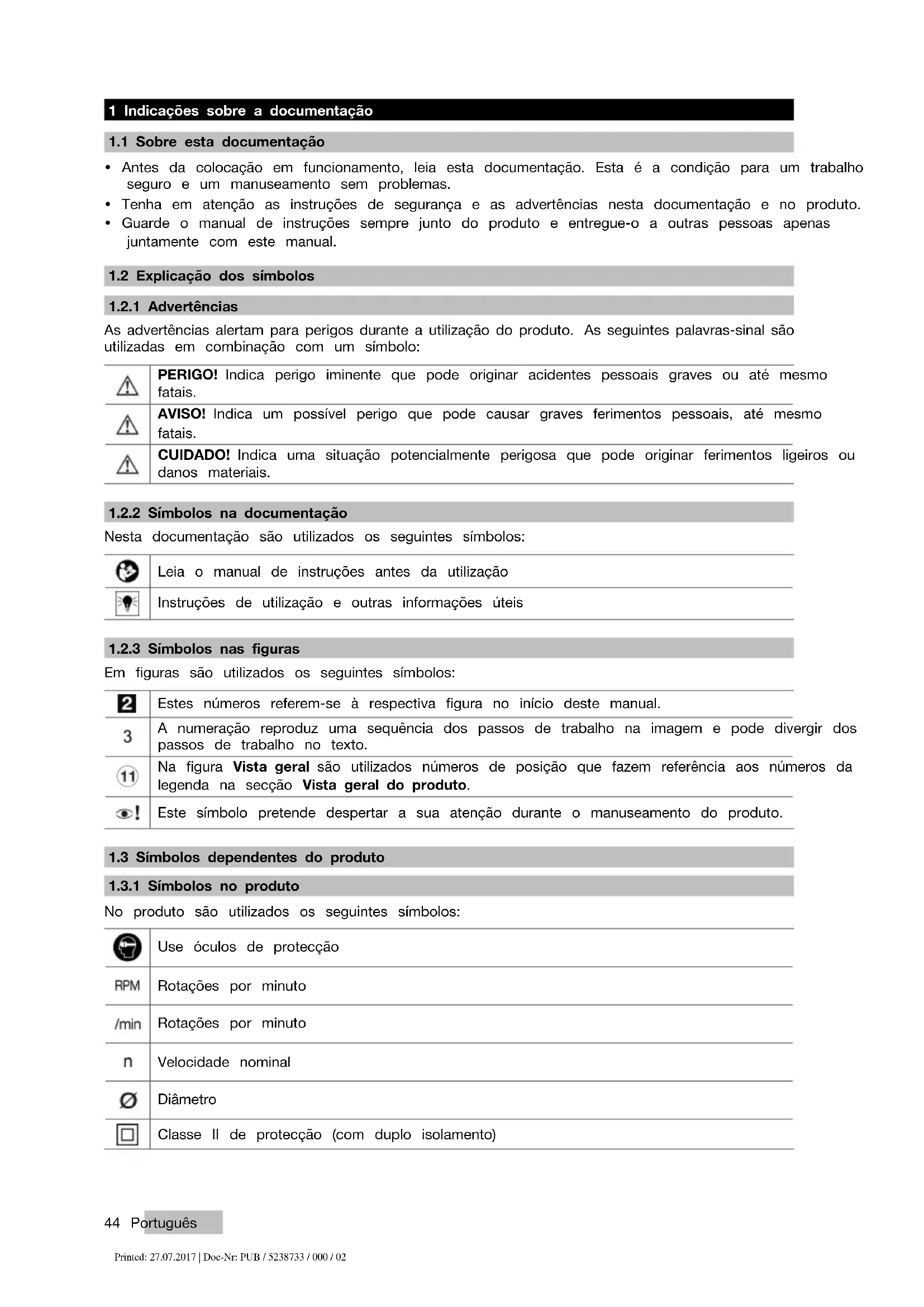 No produto são utilizados os seguintes símbolos: Use óculos de protecção Rotações por minuto Rotações por minuto Velocidade nominal Diâmetro Classe II de protecção (com duplo isolamento) Printed: 27.07.2017 | Doc-Nr: PUB / 5238733 / 000 / 02Português 45