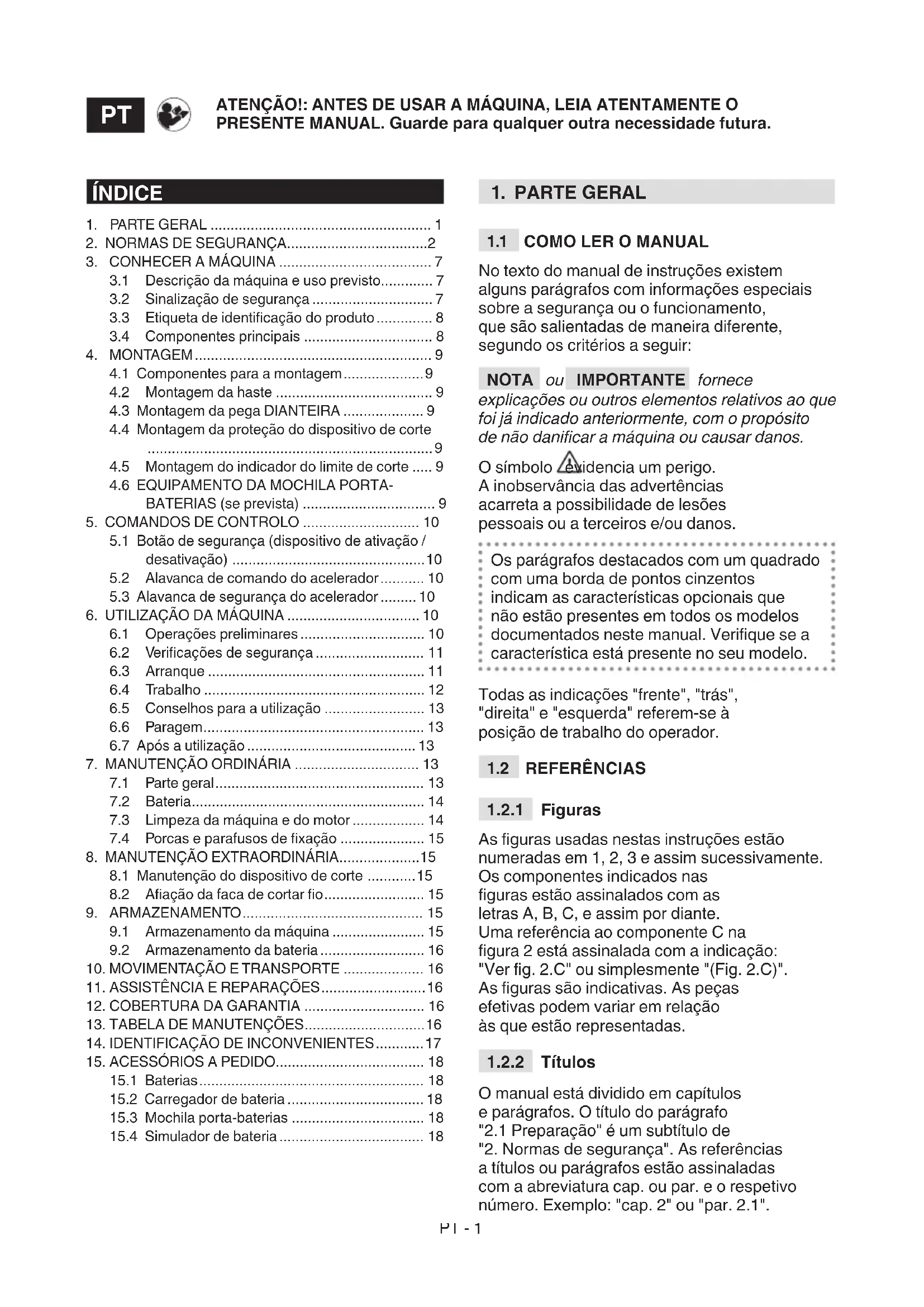 [2] Tensão de alimentação MÁX [3] Tensão de alimentação NOMINAL [4] Velocidade máxima de rotação da ferramenta (cabeça porta-o) [5] Largura de corte (cabeça porta-o) [6] Diâmetro o da cabeça (máx) [7] Código dispositivo de corte [8] Código de proteção [9] Haste exÌvel [10] Peso sem grupo bateria e sem dispositivos de corte [11] Dimensões [12] Comprimento [13] Largura [14] Altura [15] Nível de pressão sonora [16] Incerteza de medição [17] Nível medido de potência sonora [18] Nível garantido de potência sonora [19] Vibrações [20] Acessórios a pedido [21] Grupo bateria [22] Carregador de bateria [23] Mochila porta-baterias [24] Simulador de bateria (*) O uso desta bateria somente é permitido com o mochila porta- baterias. É proibido inserir a bateria no alojamento da máquina. a) NOTA: o valor total declarado das vibrações foi mensurado de acordo com um método normalizado de ensaio e pode ser utilizado para comparar uma ferramenta com a outra. O valor total das vibrações também pode ser utilizado para uma avaliação preliminar da exposição. b) ADVERTÊNCIA: a emissão de vibrações no uso efetivo da ferramenta pode ser diversa do valor total decla- rado de acordo com os modos com os quais a ferramenta é utilizada. Portan- to, durante o trabalho, é necessário adotar as seguintes medidas de segu- rança para proteger o operador: usar luvas durante o uso, limitar o tempo de utilização da máquina e encurtar o tempo durante o qual a alavanca de comando é mantida pressionada.