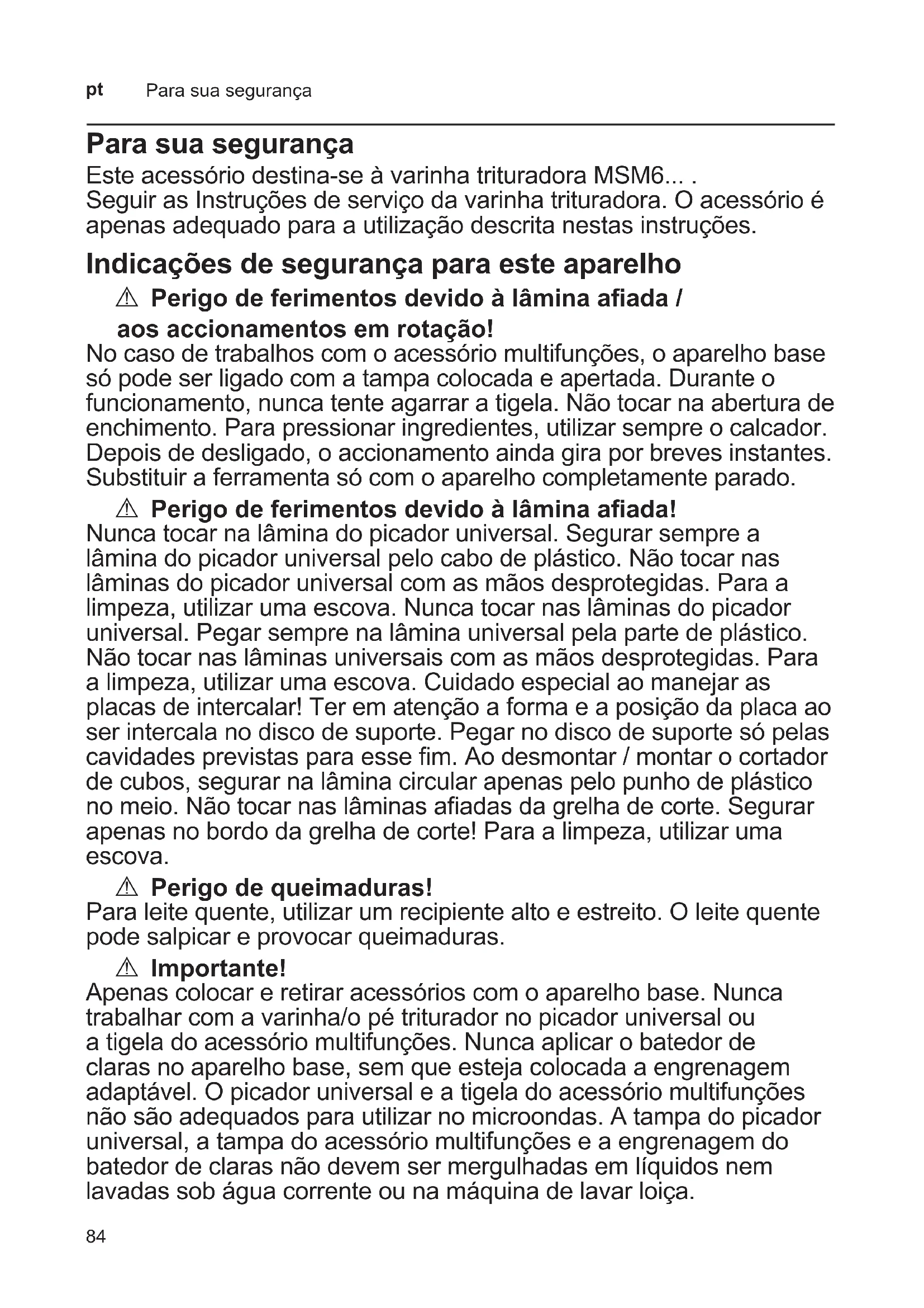 Para sua segurança Este acessório destina-se à varinha trituradora MSM6... . Seguir as Instruções de serviço da varinha trituradora. O acessório é apenas adequado para a utilização descrita nestas instruções. Indicações de segurança para este aparelho A Perigo de ferimentos devido à lâmina aada / aos accionamentos em rotação! No caso de trabalhos com o acessório multifunções, o aparelho base só pode ser ligado com a tampa colocada e apertada. Durante o funcionamento, nunca tente agarrar a tigela. Não tocar na abertura de enchimento. Para pressionar ingredientes, utilizar sempre o calcador. Depois de desligado, o accionamento ainda gira por breves instantes. Substituir a ferramenta só com o aparelho completamente parado. A Perigo de ferimentos devido à lâmina aada! Nunca tocar na lâmina do picador universal. Segurar sempre a lâmina do picador universal pelo cabo de plástico. Não tocar nas lâminas do picador universal com as mãos desprotegidas. Para a limpeza, utilizar uma escova. Nunca tocar nas lâminas do picador universal. Pegar sempre na lâmina universal pela parte de plástico. Não tocar nas lâminas universais com as mãos desprotegidas. Para a limpeza, utilizar uma escova. Cuidado especial ao manejar as placas de intercalar! Ter em atenção a forma e a posição da placa ao ser intercala no disco de suporte. Pegar no disco de suporte só pelas cavidades previstas para esse m. Ao desmontar / montar o cortador de cubos, segurar na lâmina circular apenas pelo punho de plástico no meio. Não tocar nas lâminas aadas da grelha de corte. Segurar apenas no bordo da grelha de corte! Para a limpeza, utilizar uma escova. A Perigo de queimaduras! Para leite quente, utilizar um recipiente alto e estreito. O leite quente pode salpicar e provocar queimaduras. A Importante! Apenas colocar e retirar acessórios com o aparelho base. Nunca trabalhar com a varinha/o pé triturador no picador universal ou a tigela do acessório multifunções. Nunca aplicar o batedor de claras no aparelho base, sem que esteja colocada a engrenagem adaptável. O picador universal e a tigela do acessório multifunções não são adequados para utilizar no microondas. A tampa do picador universal, a tampa do acessório multifunções e a engrenagem do batedor de claras não devem ser mergulhadas em líquidos nem lavadas sob água corrente ou na máquina de lavar loiça.85 Picador universal