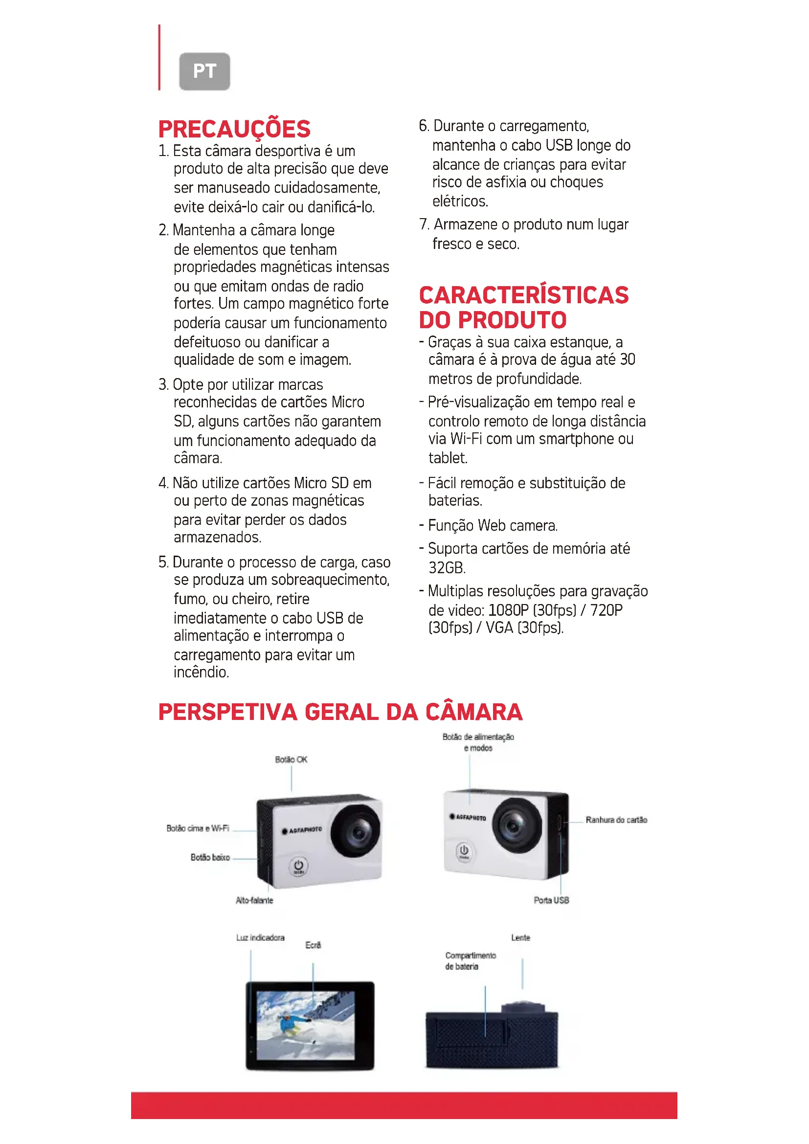 fresco e seco. CARACTERÍSTICAS DO PRODUTO - Graças à sua caixa estanque, a câmara é à prova de água até 30 metros de profundidade. - Pré-visualização em tempo real e controlo remoto de longa distância via Wi-Fi com um smartphone ou tablet. - Fácil remoção e substituição de baterias. - Função Web camera. - Suporta cartões de memória até 32GB. - Multiplas resoluções para gravação de video: 1080P (30fps) / 720P (30fps) / VGA (30fps).