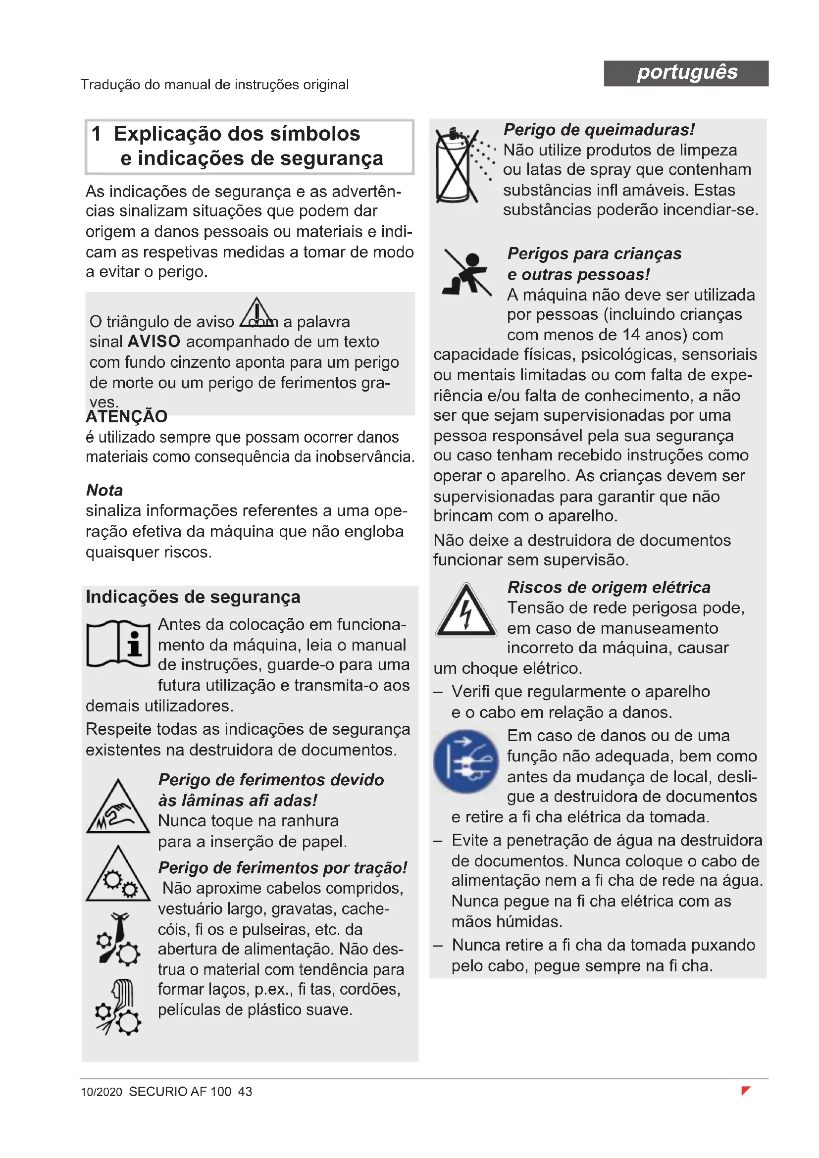 6-7 5-6 Peso 7,6 kg Anchura de entrada 225 mm Velocidad de corte 45 mm/s Conexión 220-240 V / 50/60 Hz 110-130 V / 50/60 Hz Potencia con número máx. de hojas 185 W (EU) / 160 W (US) Consumo de energía en el modo de espera < 2 Wh Tiempo de servicio de máx. número de hojas hasta 15 min Tiempo de servicio de hoja suelta hasta 20 min Condiciones ambientales en el funcionamiento: Temperatura Humedad relativa del aire Altura sobre el nivel del mar entre -10 °C y +25 °C máx. 90%, sin condensar máx. 2.000 m Medidas An x P x Al (mm) 375 x 260 x 620 Capacidad del depósito para material cortado 25 l Nivel de emisión de ruidos (Marcha en vacío / carga) 55-60 dB / 65 -70 dB Nivel de emisión de ruidos en marcha en vacío (LWAd al ralentí) 71 dB10/2020 SECURIO AF 100 43 português Tradução do manual de instruções original 1 Explicação dos símbolos e indicações de segurança As indicações de segurança e as advertên- cias sinalizam situações que podem dar origem a danos pessoais ou materiais e indi- cam as respetivas medidas a tomar de modo a evitar o perigo. Nota sinaliza informações referentes a uma ope- ração efetiva da máquina que não engloba quaisquer riscos. O triângulo de aviso com a palavra sinal AVISO acompanhado de um texto com fundo cinzento aponta para um perigo de morte ou um perigo de ferimentos gra- ves. ATENÇÃO é utilizado sempre que possam ocorrer danos materiais como consequência da inobservância. Indicações de segurança Antes da colocação em funciona- mento da máquina, leia o manual de instruções, guarde-o para uma futura utilização e transmita-o aos demais utilizadores. Respeite todas as indicações de segurança existentes na destruidora de documentos. Perigo de ferimentos devido às lâminas afi adas! Nunca toque na ranhura para a inserção de papel. Perigo de ferimentos por tração! Não aproxime cabelos compridos, vestuário largo, gravatas, cache- cóis, fi os e pulseiras, etc. da abertura de alimentação. Não des- trua o material com tendência para formar laços, p.ex., fi tas, cordões, películas de plástico suave. Perigo de queimaduras! Não utilize produtos de limpeza ou latas de spray que contenham substâncias infl amáveis. Estas substâncias poderão incendiar-se. Perigos para crianças e outras pessoas! A máquina não deve ser utilizada por pessoas (incluindo crianças com menos de 14 anos) com capacidade físicas, psicológicas, sensoriais ou mentais limitadas ou com falta de expe- riência e/ou falta de conhecimento, a não ser que sejam supervisionadas por uma pessoa responsável pela sua segurança ou caso tenham recebido instruções como operar o aparelho. As crianças devem ser supervisionadas para garantir que não brincam com o aparelho. Não deixe a destruidora de documentos funcionar sem supervisão. Riscos de origem elétrica Tensão de rede perigosa pode, em caso de manuseamento incorreto da máquina, causar um choque elétrico. – Verifi que regularmente o aparelho e o cabo em relação a danos. Em caso de danos ou de uma função não adequada, bem como antes da mudança de local, desli- gue a destruidora de documentos e retire a fi cha elétrica da tomada. – Evite a penetração de água na destruidora de documentos. Nunca coloque o cabo de alimentação nem a fi cha de rede na água. Nunca pegue na fi cha elétrica com as mãos húmidas. – Nunca retire a fi cha da tomada puxando pelo cabo, pegue sempre na fi cha.44 SECURIO AF 100 10/2020 português 3 Vista geral