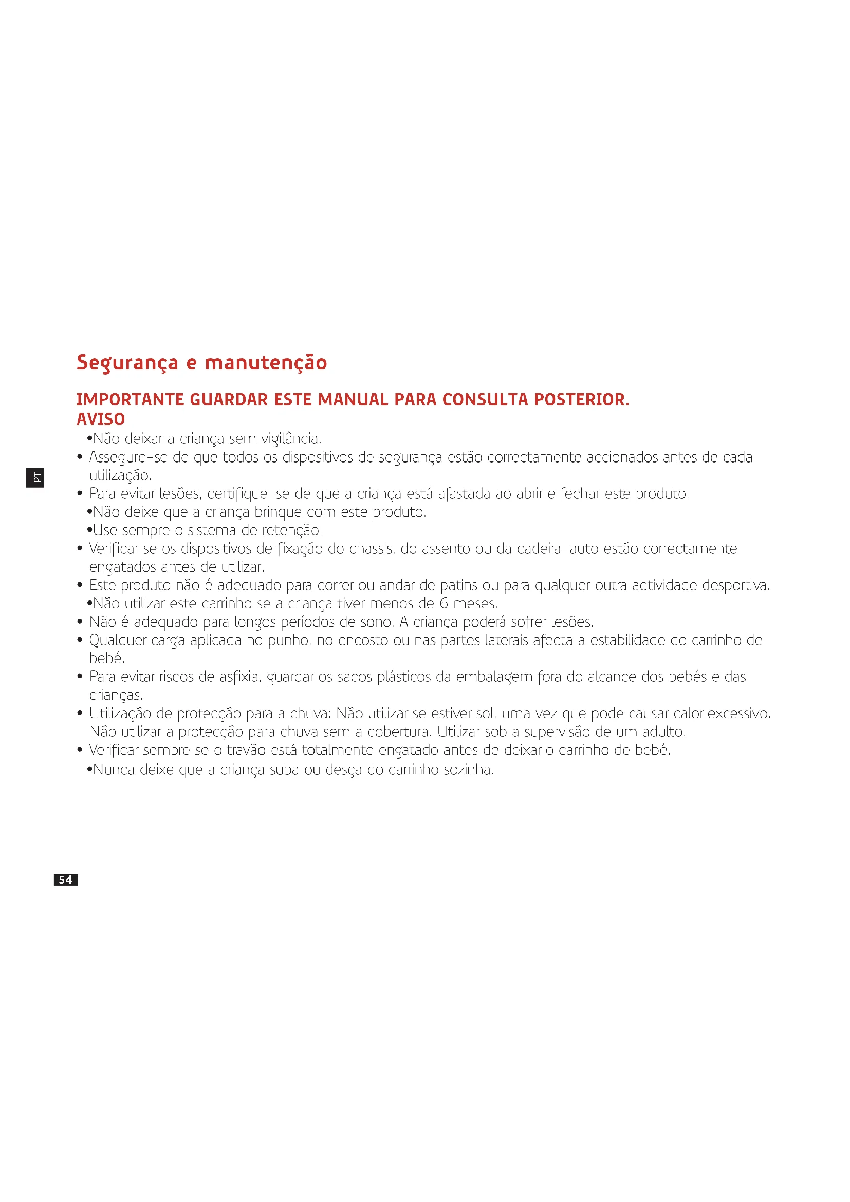 ATENÇÃO: Utilize sempre cinto de segurança. ATENÇÃO: Inspecione periodicamente as condições mecânicas do carrinho. Declaramos que acessórios que não foram aprovados pelo fabricante não podem ser utilizados. ATENÇÃO: Não pendure nenhum peso na alça do carrinho. ATENÇÃO: Sempre utilize a tira entrepernas em combinação com o cinto abdominal. ATENÇÃO: Não podem ser utilizados acessórios não aprovados pelo fabricante. ATENÇÃO: Verificar se os dispositivos de fixação do cesto para bebês ou da unidade de assento estão corretamente encaixados antes do uso. ADVERTÊNCIA: Este produto não pode ser utilizado para correr ou patinar. PT HE ET BG SK SI HR HU TR FI NO SV DA CS RU GR PL PT IT ES NL DE FR EN108108 BRBR SEGURANCA Os nossos produtos foram concebidos e testados com cuidado para assegurar a segurança e o conforto da sua criança. Em conformidade com os requisitos de segurança – Testado em laboratório certificado segundo a norma ABNT NBR 14389:2010.