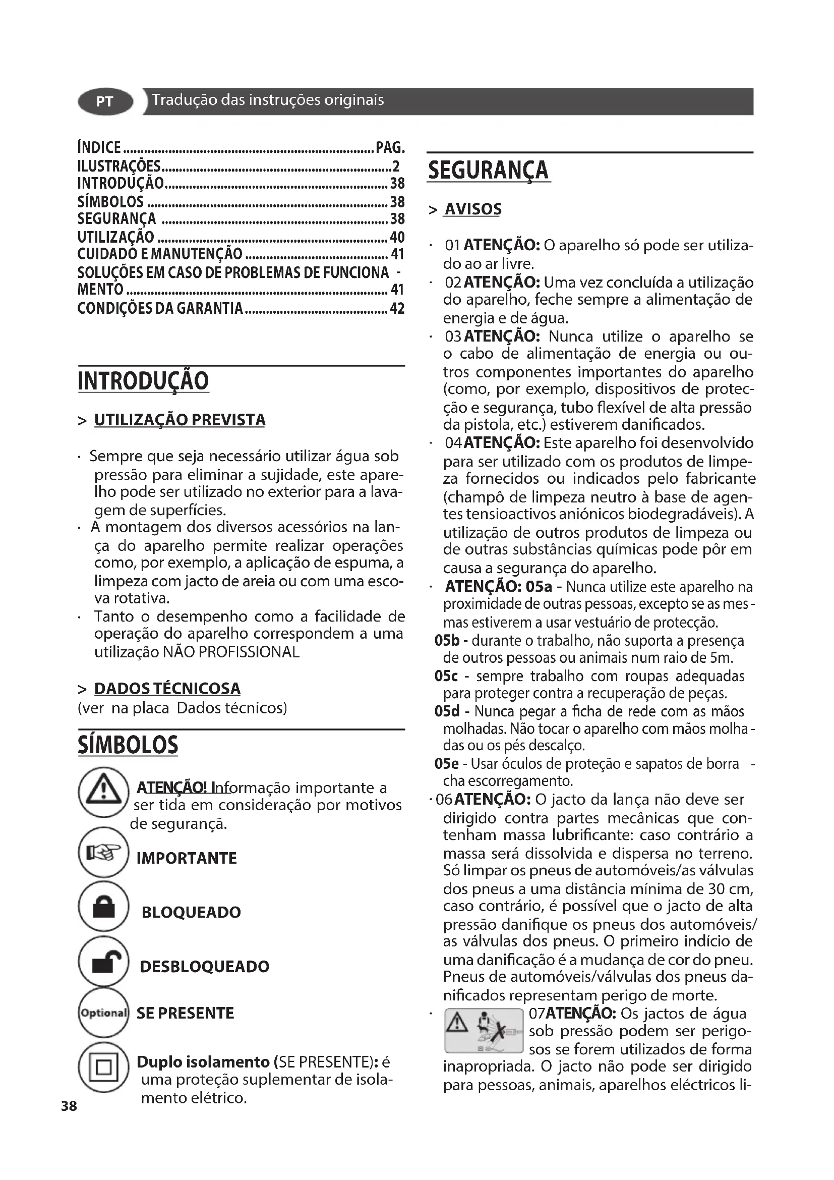 07ATENÇÃO: Os jactos de água sob pressão podem ser perigo- sos se forem utilizados de forma inapropriada. O jacto não pode ser dirigido para pessoas, animais, aparelhos eléctricos li- ÍNDICE ........................................................................ PAG. ILUSTRAÇÕES .................................................................. 2 INTRODUÇÃO ................................................................ 38 SÍMBOLOS ..................................................................... 38 SEGURANÇA ................................................................. 38 UTILIZAÇÃO .................................................................. 40