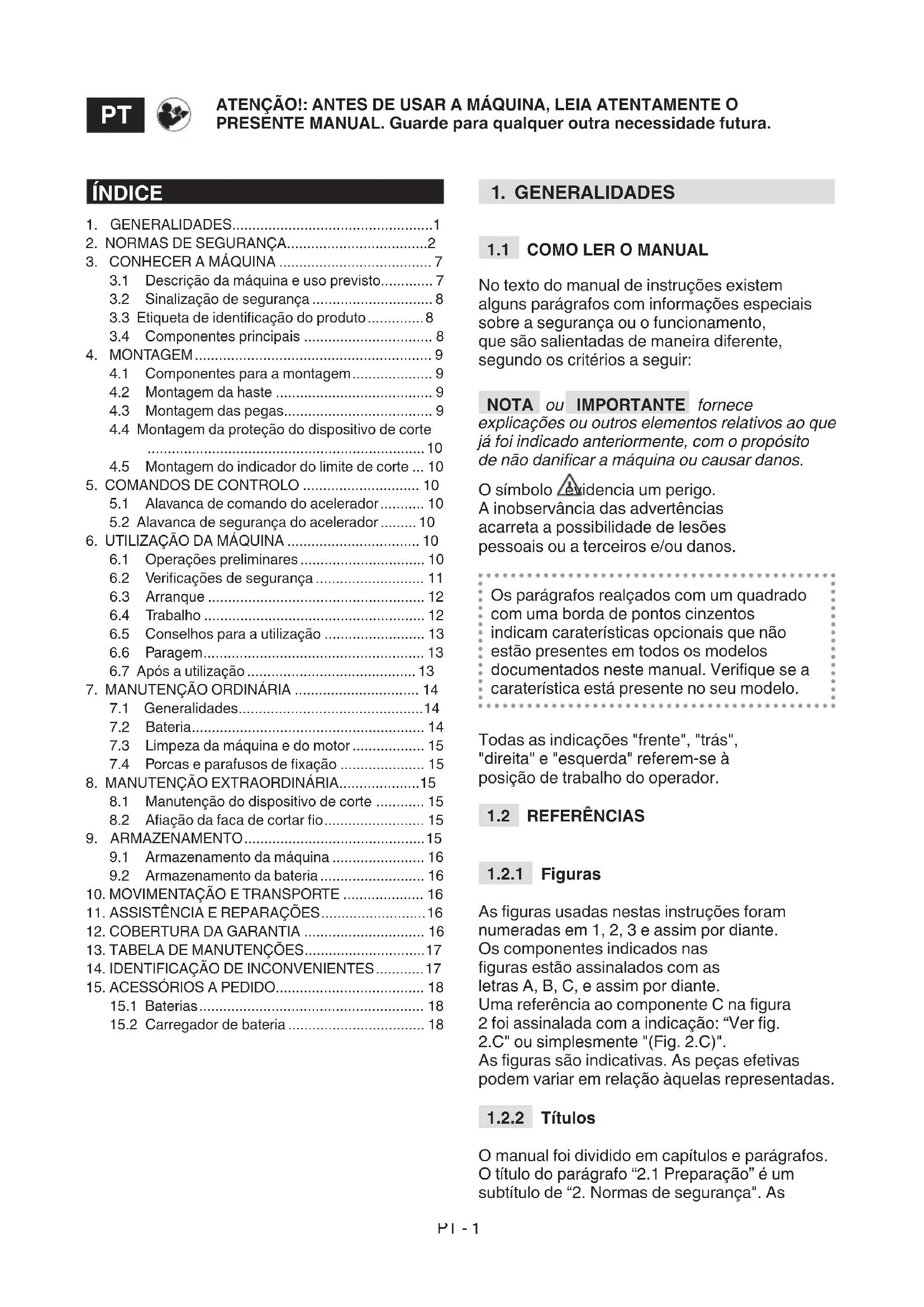 Qualquer outro uso, não conforme àqueles acima citados, pode ser perigoso e causar danos a pessoas e/ou objetos. Incluem-se no uso inadequado (como, por exemplo, mas não somente): – Utilizar a máquina para varrer, inclinando o cabeçote porta-o. A potência do motor pode arremessar objetos e pequenas pedras até 15 metros ou mais, causando danos ou provocando lesões em pessoas; – acertar sebes ou outros trabalhos nos quais o dispositivo de corte não seja usado ao nível do solo; – cortar ou triturar arbustos, moitas e ores; – usar a máquina para o corte de materiais de origem não vegetal;PT - 8 – usar a máquina com o dispositivo de corte acima da linha de cintura do operador; – usar a máquina em jardins públicos, parques, centros desportivos, em ruas, campos e bosques; – usar dispositivos de corte diferentes daqueles enumerados na tabela "Dados Técnicos". Perigo de feridas e lesões graves. – utilizar a máquina por mais de uma pessoa. IMPORTANTE O uso inadequado da máquina provoca a perda da garantia e exime o Fabricante de toda e qualquer responsabilidade, competindo ao utilizados os ónus decorrentes de danos ou lesões próprias ou a terceiros.