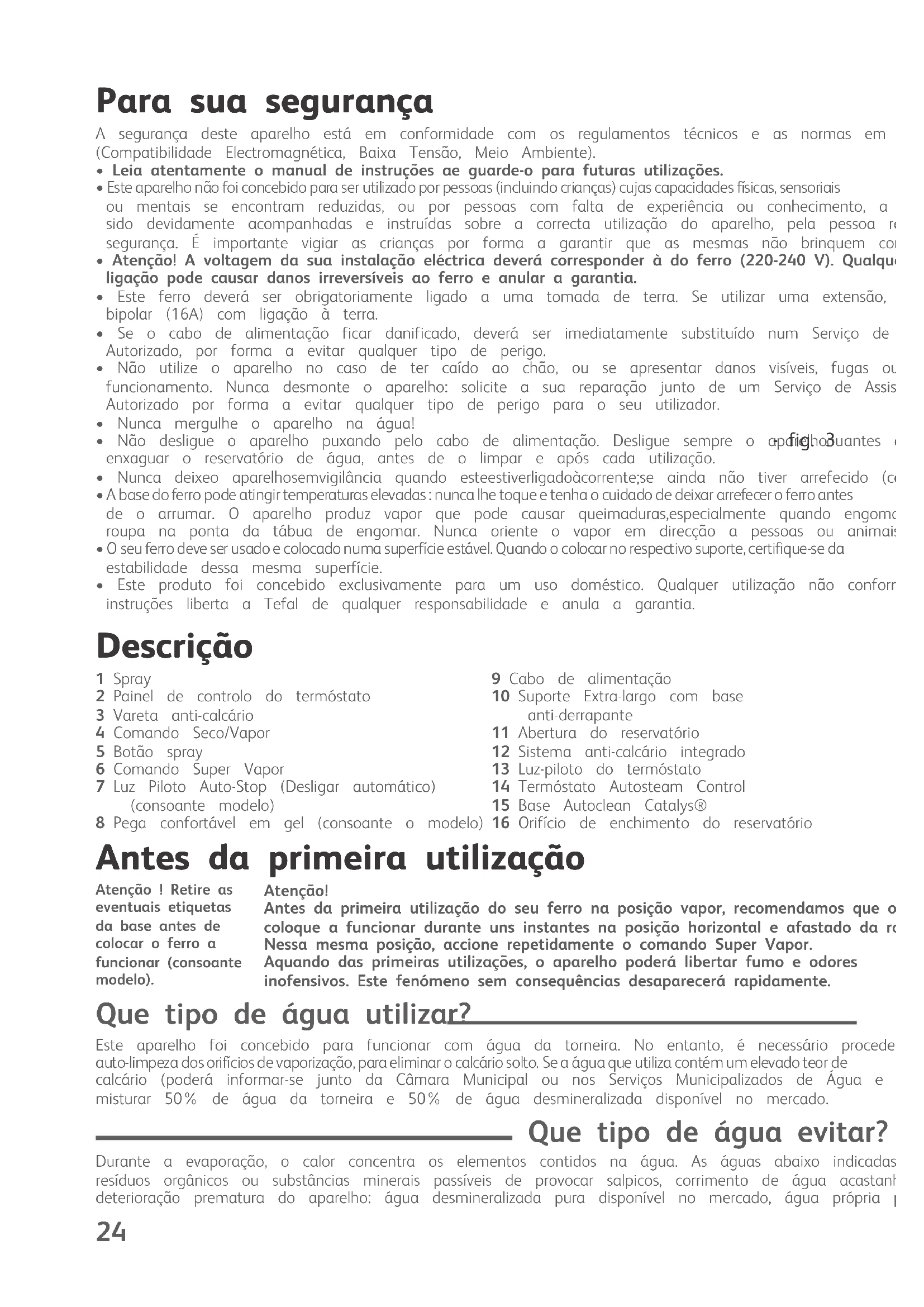 - Este aparelho não foi concebido para ser utilizado por pessoas (incluindo crianças) cujas capacidades físicas, sensoriais ou mentais se encontram reduzidas, ou por pessoas com falta de experiência ou conhecimento, a não ser que tenhamsido devidamente acompanhadas e instruídas sobre a correcta utilização do aparelho, pela pessoa responsável pela suasegurança. É importante vigiar as crianças por forma a garantir que as mesmas não brinquem com o aparelho.• Atenção! A voltagem da sua instalação eléctrica deverá corresponder à do ferro (220-240 V). Qualquer erro deligação pode causar danos irreversíveis ao ferro e anular a garantia.• Este ferro deverá ser obrigatoriamente ligado a uma tomada de terra. Se utilizar uma extensão, verifique se é do tipobipolar (16A) com ligação à terra.• Se o cabo de alimentação ficar danificado, deverá ser imediatamente substituído num Serviço de Assistência TécnicaAutorizado, por forma a evitar qualquer tipo de perigo.• Não utilize o aparelho no caso de ter caído ao chão, ou se apresentar danos visíveis, fugas ou anomalias defuncionamento. Nunca desmonte o aparelho: solicite a sua reparação junto de um Serviço de Assistência TécnicaAutorizado por forma a evitar qualquer tipo de perigo para o seu utilizador.• Nunca mergulhe o aparelho na água!• Não desligue o aparelho puxando pelo cabo de alimentação. Desligue sempre o aparelho: antes de encher - fig. 3