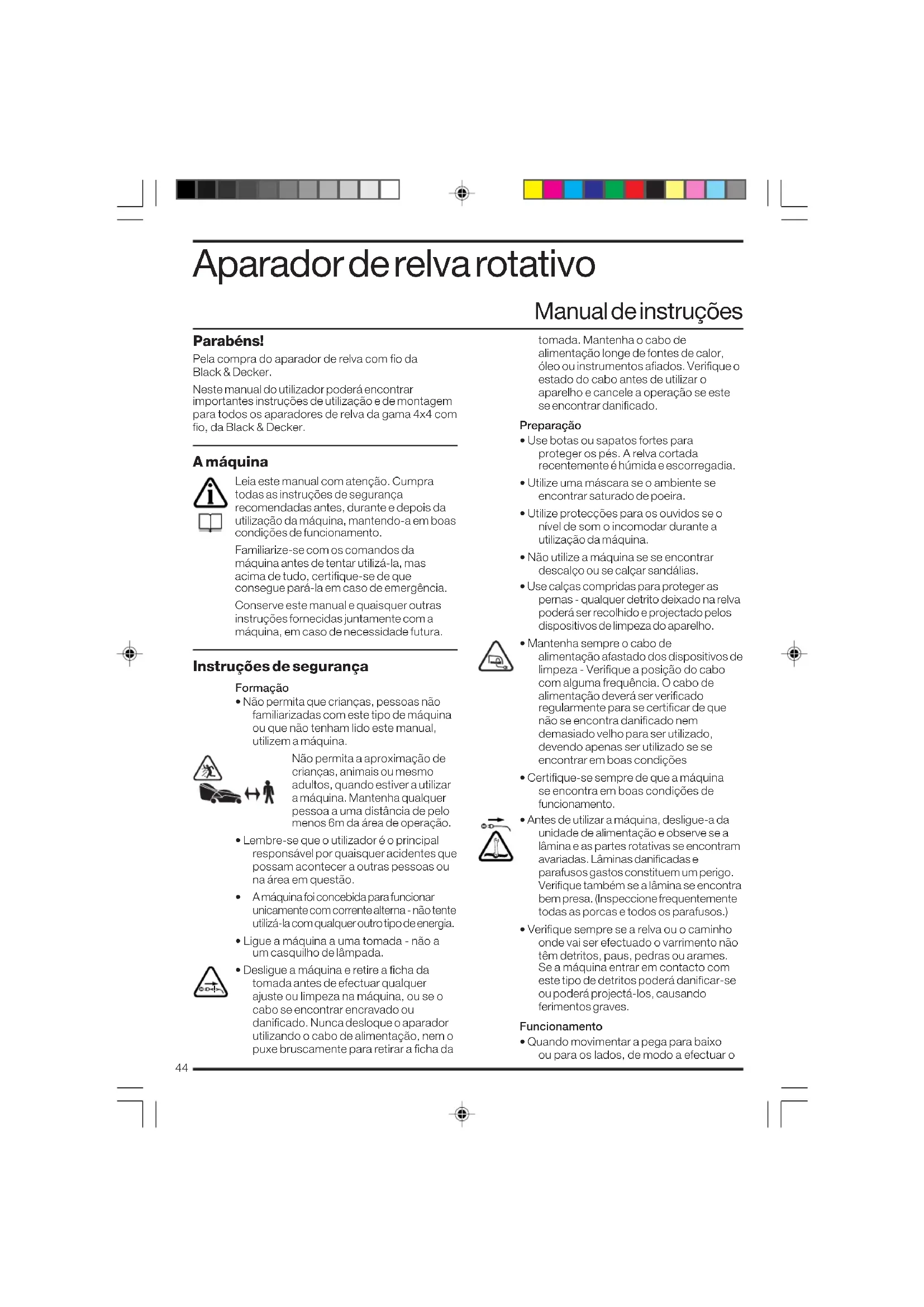 Brian Cooke Director de Ingeniería Spennymoor, County Durham DL16 6JG, United Kingdom 1-12-2001 Motosierras Recortabordes Recortasetos Cortacéspedes Escarificadores Aspiradores-sopladores Todos los productos no se encuentran disponibles en todos los países.44 Aparador de relva rotativo Manual de instruções Parabéns! Pela compra do aparador de relva com fio da Black & Decker. Neste manual do utilizador poderá encontrar importantes instruções de utilização e de montagem para todos os aparadores de relva da gama 4x4 com fio, da Black & Decker. A máquina Leia este manual com atenção. Cumpra todas as instruções de segurança recomendadas antes, durante e depois da utilização da máquina, mantendo-a em boas condições de funcionamento. Familiarize-se com os comandos da máquina antes de tentar utilizá-la, mas acima de tudo, certifique-se de que consegue pará-la em caso de emergência. Conserve este manual e quaisquer outras instruções fornecidas juntamente com a máquina, em caso de necessidade futura. Instruções de segurança Formação