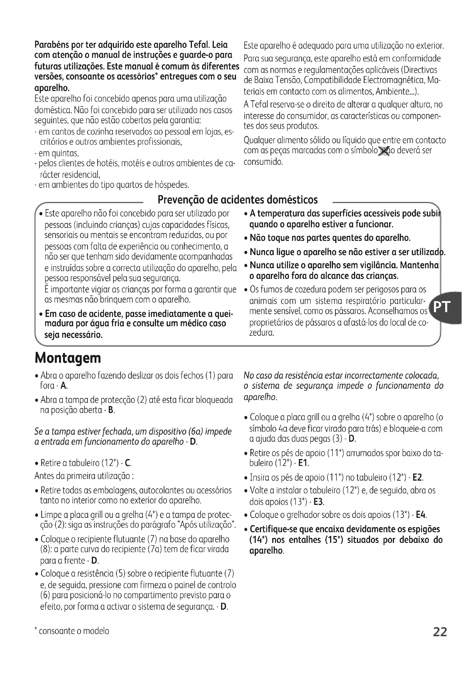 - según modelo ES22 Parabéns por ter adquirido este aparelho Tefal. Leia com atenção o manual de instruções e guarde-o para futuras utilizações. Este manual é comum às diferentes versões, consoante os acessórios* entregues com o seu aparelho. Este aparelho foi concebido apenas para uma utilização doméstica. Não foi concebido para ser utilizado nos casos seguintes, que não estão cobertos pela garantia: - em cantos de cozinha reservados ao pessoal em lojas, es- critórios e outros ambientes profissionais, - em quintas, - pelos clientes de hotéis, motéis e outros ambientes de ca- rácter residencial, - em ambientes do tipo quartos de hóspedes. Este aparelho é adequado para uma utilização no exterior. Para sua segurança, este aparelho está em conformidade com as normas e regulamentações aplicáveis (Directivas de Baixa Tensão, Compatibilidade Electromagnética, Ma- teriais em contacto com os alimentos, Ambiente...). A Tefal reserva-se o direito de alterar a qualquer altura, no interesse do consumidor, as características ou componen- tes dos seus produtos. Qualquer alimento sólido ou líquido que entre em contacto com as peças marcadas com o símbolo não deverá ser consumido. Prevenção de acidentes domésticos