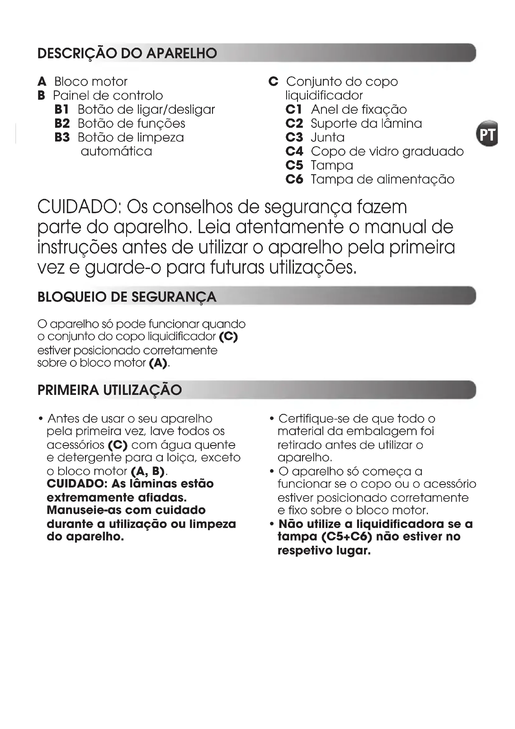 A Bloco motor B Painel de controlo B1 Botão de ligar/desligar B2 Botão de funções B3 Botão de limpeza automática C Conjunto do copo liquidificador C1 Anel de fixação C2 Suporte da lâmina C3 Junta C4 Copo de vidro graduado C5 Tampa C6 Tampa de alimentação O aparelho só pode funcionar quando o conjunto do copo liquidificador (C) estiver posicionado corretamente sobre o bloco motor (A). CUIDADO: Os conselhos de segurança fazem parte do aparelho. Leia atentamente o manual de instruções antes de utilizar o aparelho pela primeira vez e guarde-o para futuras utilizações.