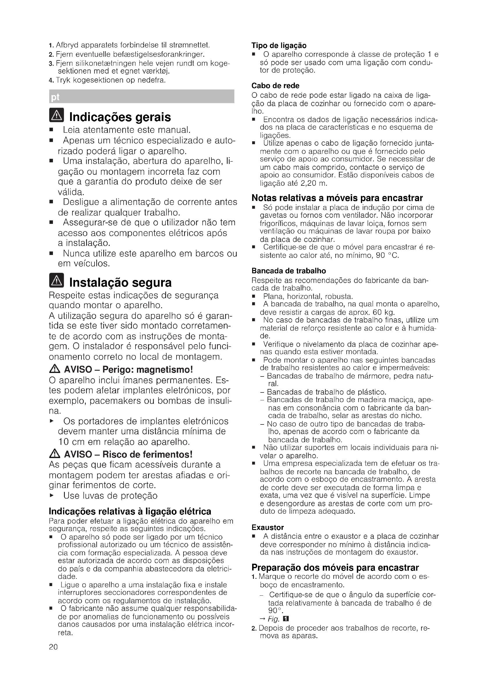 Indicações gerais ¡ Leia atentamente este manual. ¡ Apenas um técnico especializado e auto- rizado poderá ligar o aparelho. ¡ Uma instalação, abertura do aparelho, li- gação ou montagem incorreta faz com que a garantia do produto deixe de ser válida. ¡ Desligue a alimentação de corrente antes de realizar qualquer trabalho. ¡ Assegurar-se de que o utilizador não tem acesso aos componentes elétricos após a instalação. ¡ Nunca utilize este aparelho em barcos ou em veículos. Instalação segura Respeite estas indicações de segurança quando montar o aparelho. A utilização segura do aparelho só é garan- tida se este tiver sido montado corretamen- te de acordo com as instruções de monta- gem. O instalador é responsável pelo funci- onamento correto no local de montagem. AVISO‒Perigo: magnetismo! O aparelho inclui ímanes permanentes. Es- tes podem afetar implantes eletrónicos, por exemplo, pacemakers ou bombas de insuli- na. ▶ Os portadores de implantes eletrónicos devem manter uma distância mínima de 10cm em relação ao aparelho. AVISO‒Risco de ferimentos! As peças que ficam acessíveis durante a montagem podem ter arestas afiadas e ori- ginar ferimentos de corte. ▶ Use luvas de proteção Indicações relativas à ligação elétrica Para poder efetuar a ligação elétrica do aparelho em segurança, respeite as seguintes indicações. ¡ O aparelho só pode ser ligado por um técnico profissional autorizado ou um técnico de assistên- cia com formação especializada. A pessoa deve estar autorizada de acordo com as disposições do país e da companhia abastecedora da eletrici- dade. ¡ Ligue o aparelho a uma instalação fixa e instale interruptores seccionadores correspondentes de acordo com os regulamentos de instalação. ¡ O fabricante não assume qualquer responsabilida- de por anomalias de funcionamento ou possíveis danos causados por uma instalação elétrica incor- reta. Tipo de ligação ¡ O aparelho corresponde à classe de proteção 1 e só pode ser usado com uma ligação com condu- tor de proteção. Cabo de rede O cabo de rede pode estar ligado na caixa de liga- ção da placa de cozinhar ou fornecido com o apare- lho. ¡ Encontra os dados de ligação necessários indica- dos na placa de características e no esquema de ligações. ¡ Utilize apenas o cabo de ligação fornecido junta- mente com o aparelho ou que é fornecido pelo serviço de apoio ao consumidor. Se necessitar de um cabo mais comprido, contacte o serviço de apoio ao consumidor. Estão disponíveis cabos de ligação até 2,20m. Notas relativas a móveis para encastrar ¡ Só pode instalar a placa de indução por cima de gavetas ou fornos com ventilador. Não incorporar frigoríficos, máquinas de lavar loiça, fornos sem ventilação ou máquinas de lavar roupa por baixo da placa de cozinhar. ¡ Certifique-se de que o móvel para encastrar é re- sistente ao calor até, no mínimo, 90°C. Bancada de trabalho Respeite as recomendações do fabricante da ban- cada de trabalho. ¡ Plana, horizontal, robusta. ¡ A bancada de trabalho, na qual monta o aparelho, deve resistir a cargas de aprox. 60kg. ¡ No caso de bancadas de trabalho finas, utilize um material de reforço resistente ao calor e à humida- de. ¡ Verifique o nivelamento da placa de cozinhar ape- nas quando esta estiver montada. ¡ Pode montar o aparelho nas seguintes bancadas de trabalho resistentes ao calor e impermeáveis: – Bancadas de trabalho de mármore, pedra natu- ral. – Bancadas de trabalho de plástico. – Bancadas de trabalho de madeira maciça, ape- nas em consonância com o fabricante da ban- cada de trabalho, selar as arestas do nicho. – No caso de outro tipo de bancadas de traba- lho, apenas de acordo com o fabricante da bancada de trabalho. ¡ Não utilizar suportes em locais individuais para ni- velar o aparelho. ¡ Uma empresa especializada tem de efetuar os tra- balhos de recorte na bancada de trabalho, de acordo com o esboço de encastramento. A aresta de corte deve ser executada de forma limpa e exata, uma vez que é visível na superfície. Limpe e desengordure as arestas de corte com um pro- duto de limpeza adequado. Exaustor ¡ A distância entre o exaustor e a placa de cozinhar deve corresponder no mínimo à distância indica- da nas instruções de montagem do exaustor. Preparação dos móveis para encastrar