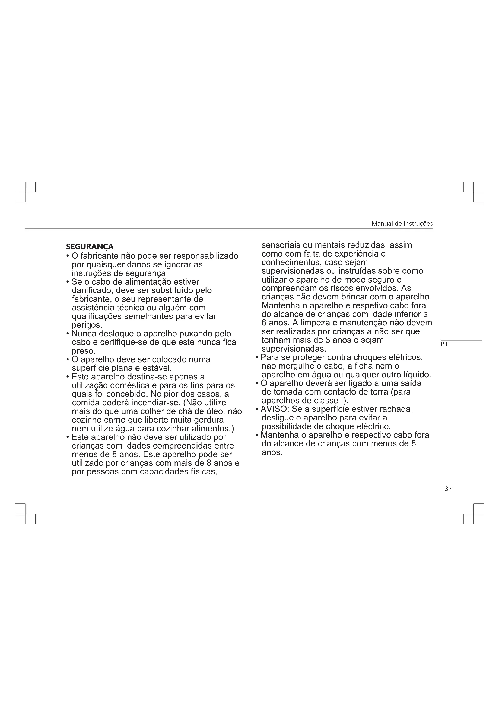 - Mantenha o aparelho e respectivo cabo fora do alcance de crianças com menos de 8 anos. PTManual de Instruções
