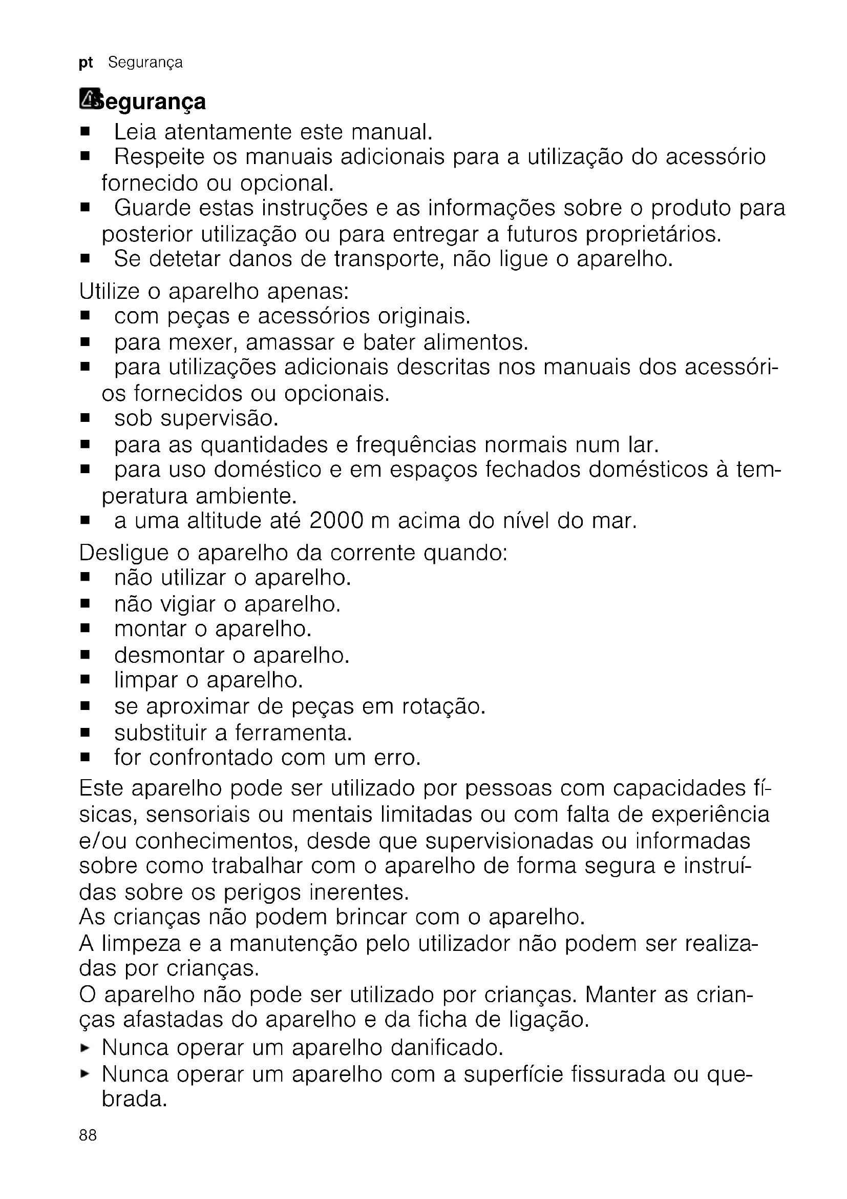 www.bosch-home.com en las secciones referentes al producto y servicio al cliente, en el área de manuales y documentos. 87pt Segurança Segurança Segurança ¡ Leia atentamente este manual. ¡ Respeite os manuais adicionais para a utilização do acessório fornecido ou opcional. ¡ Guarde estas instruções e as informações sobre o produto para posterior utilização ou para entregar a futuros proprietários. ¡ Se detetar danos de transporte, não ligue o aparelho. Utilize o aparelho apenas: ¡ com peças e acessórios originais. ¡ para mexer, amassar e bater alimentos. ¡ para utilizações adicionais descritas nos manuais dos acessóri- os fornecidos ou opcionais. ¡ sob supervisão. ¡ para as quantidades e frequências normais num lar. ¡ para uso doméstico e em espaços fechados domésticos à tem- peratura ambiente. ¡ a uma altitude até 2000m acima do nível do mar. Desligue o aparelho da corrente quando: ¡ não utilizar o aparelho. ¡ não vigiar o aparelho. ¡ montar o aparelho. ¡ desmontar o aparelho. ¡ limpar o aparelho. ¡ se aproximar de peças em rotação. ¡ substituir a ferramenta. ¡ for confrontado com um erro. Este aparelho pode ser utilizado por pessoas com capacidades fí- sicas, sensoriais ou mentais limitadas ou com falta de experiência e/ou conhecimentos, desde que supervisionadas ou informadas sobre como trabalhar com o aparelho de forma segura e instruí- das sobre os perigos inerentes. As crianças não podem brincar com o aparelho. A limpeza e a manutenção pelo utilizador não podem ser realiza- das por crianças. O aparelho não pode ser utilizado por crianças. Manter as crian- ças afastadas do aparelho e da ficha de ligação. Nunca operar um aparelho danificado. Nunca operar um aparelho com a superfície fissurada ou que- brada. 88Segurança pt Para desligar o aparelho da fonte de alimentação nunca puxar pelo cabo elétrico. Remover o cabo elétrico sempre pela ficha. Se o aparelho ou o cabo elétrico estiver avariado, puxe o cabo ou a ficha da tomada ou desligue o fusível no quadro elétrico. Contactar a Assistência Técnica.