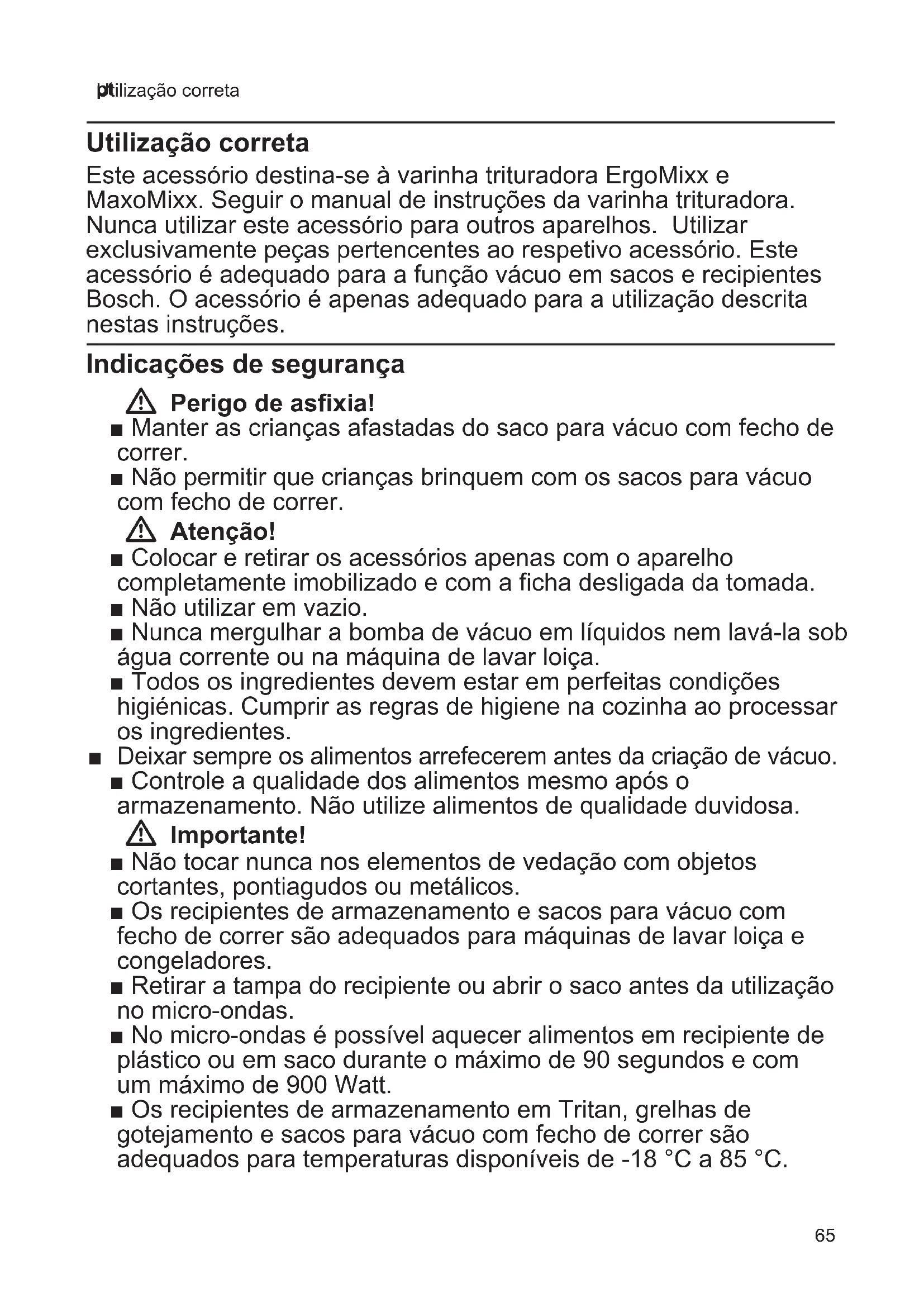 Utilização correta Utilização correta Este acessório destina-se à varinha trituradora ErgoMixx e MaxoMixx. Seguir o manual de instruções da varinha trituradora. Nunca utilizar este acessório para outros aparelhos. Utilizar exclusivamente peças pertencentes ao respetivo acessório. Este acessório é adequado para a função vácuo em sacos e recipientes Bosch. O acessório é apenas adequado para a utilização descrita nestas instruções. Indicações de segurança W Perigo de asfixia! ■ Manter as crianças afastadas do saco para vácuo com fecho de correr. ■ Não permitir que crianças brinquem com os sacos para vácuo com fecho de correr. W Atenção! ■ Colocar e retirar os acessórios apenas com o aparelho completamente imobilizado e com a ficha desligada da tomada. ■ Não utilizar em vazio. ■ Nunca mergulhar a bomba de vácuo em líquidos nem lavá-la sob água corrente ou na máquina de lavar loiça. ■ Todos os ingredientes devem estar em perfeitas condições higiénicas. Cumprir as regras de higiene na cozinha ao processar os ingredientes. ■ Deixar sempre os alimentos arrefecerem antes da criação de vácuo. ■ Controle a qualidade dos alimentos mesmo após o armazenamento. Não utilize alimentos de qualidade duvidosa. W Importante! ■ Não tocar nunca nos elementos de vedação com objetos cortantes, pontiagudos ou metálicos. ■ Os recipientes de armazenamento e sacos para vácuo com fecho de correr são adequados para máquinas de lavar loiça e congeladores. ■ Retirar a tampa do recipiente ou abrir o saco antes da utilização no micro-ondas. ■ No micro-ondas é possível aquecer alimentos em recipiente de plástico ou em saco durante o máximo de 90 segundos e com um máximo de 900 Watt. ■ Os recipientes de armazenamento em Tritan, grelhas de gotejamento e sacos para vácuo com fecho de correr são adequados para temperaturas disponíveis de -18 °C a 85 °C.66 pt Indicações de segurança Panorâmica do aparelho X Fig. A 1 Bomba de vácuo a Válvula de vácuo b Ligação para aparelho base 2 Recipiente de armazenamento * a Recipiente em: – plástico Tritan * – vidro * b Grelha para pingos * c Tampa d Clipes de fecho e Fecho de vácuo f Indicação de vácuo g Anéis de ajuste da data (dia/mês) h Vedação da tampa 3 Saco para vácuo com fecho de correr * a Fecho de correr b Linha de marcação max c Fecho de vácuo