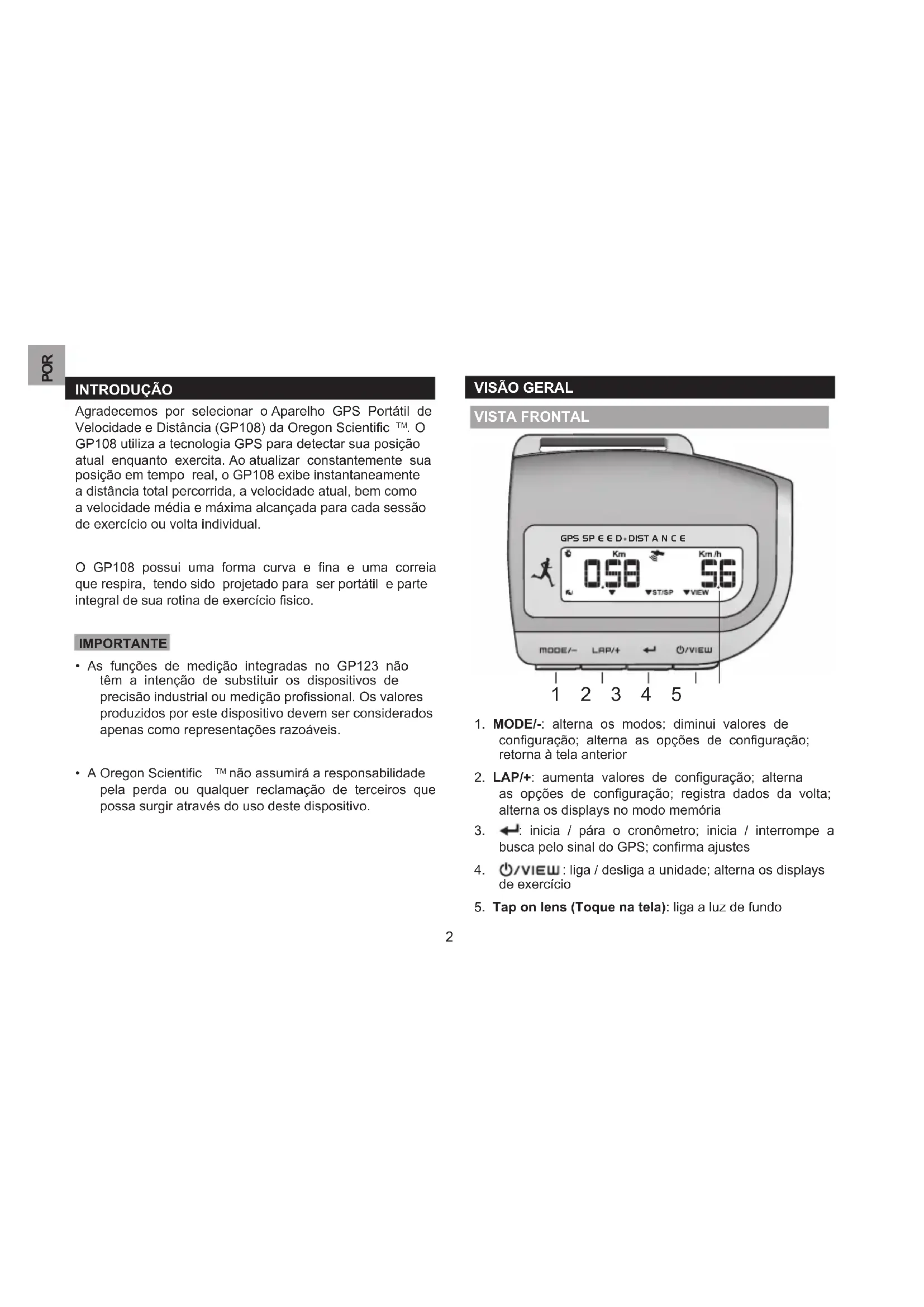 INTRODUÇÃO Agradecemos por selecionar o Aparelho GPS Portátil de Velocidade e Distância (GP108) da Oregon Scientific