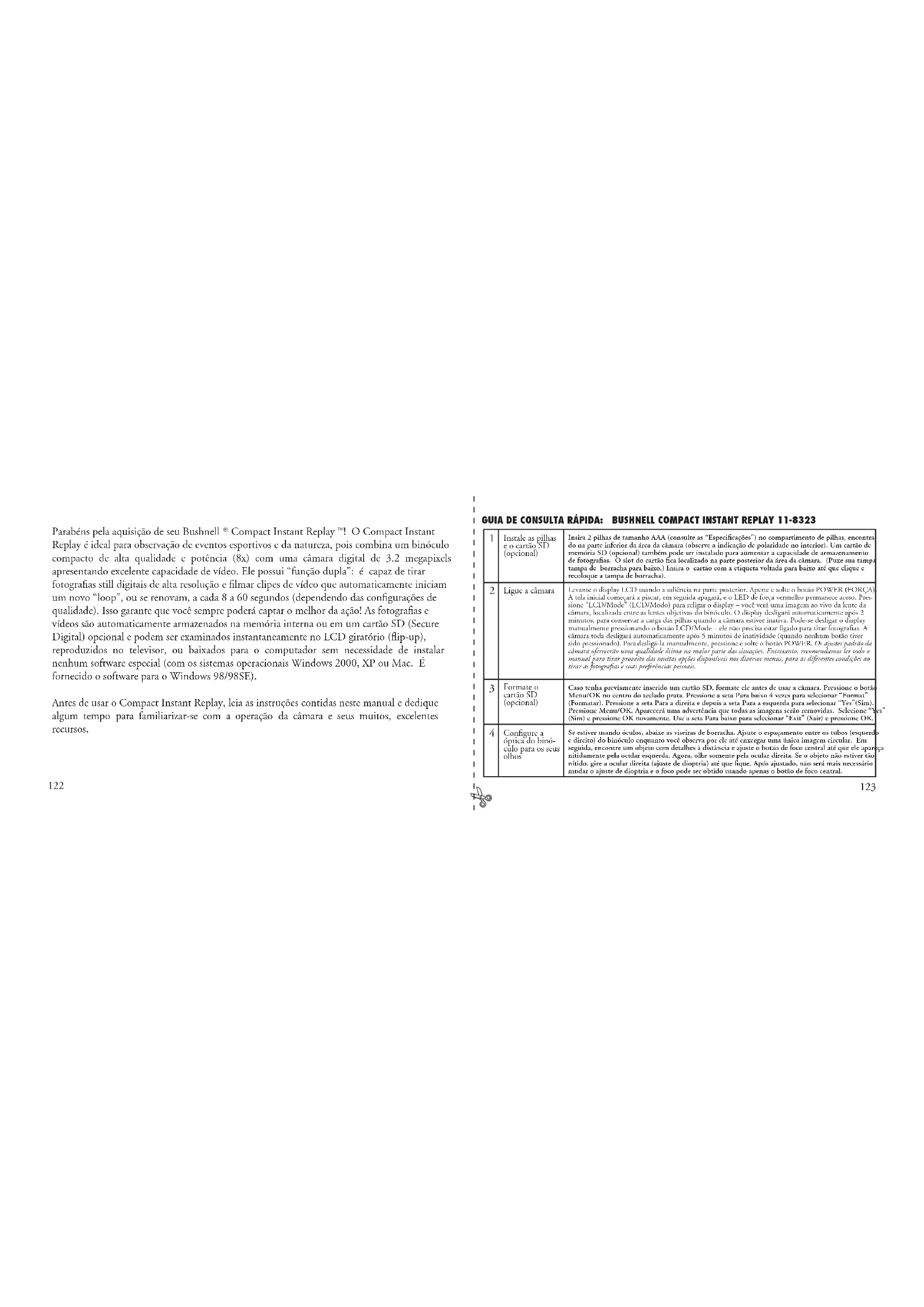 ! O Compact Instant Replay é ideal para observação de eventos esportivos e da natureza, pois combina um binóculo compacto de alta qualidade e potência (8x) com uma câmara digital de 3.2 megapixels apresentando excelente capacidade de vídeo. Ele possui “função dupla”: é capaz de tirar fotografias still digitais de alta resolução e filmar clipes de vídeo que automaticamente iniciam um novo “loop”, ou se renovam, a cada 8 a 60 segundos (dependendo das configurações de qualidade). Isso garante que você sempre poderá captar o melhor da ação! As fotografias e vídeos são automaticamente armazenados na memória interna ou em um cartão SD (Secure Digital) opcional e podem ser examinados instantaneamente no LCD giratório (flip-up), reproduzidos no televisor, ou baixados para o computador sem necessidade de instalar nenhum software especial (com os sistemas operacionais Windows 2000, XP ou Mac. É fornecido o software para o Windows 98/98SE). Antes de usar o Compact Instant Replay, leia as instruções contidas neste manual e dedique algum tempo para familiarizar-se com a operação da câmara e seus muitos, excelentes recursos. GUIA DE CONSULTA RÁPIDA: BUSHNELL COMPACT INSTANT REPLAY 11-8323