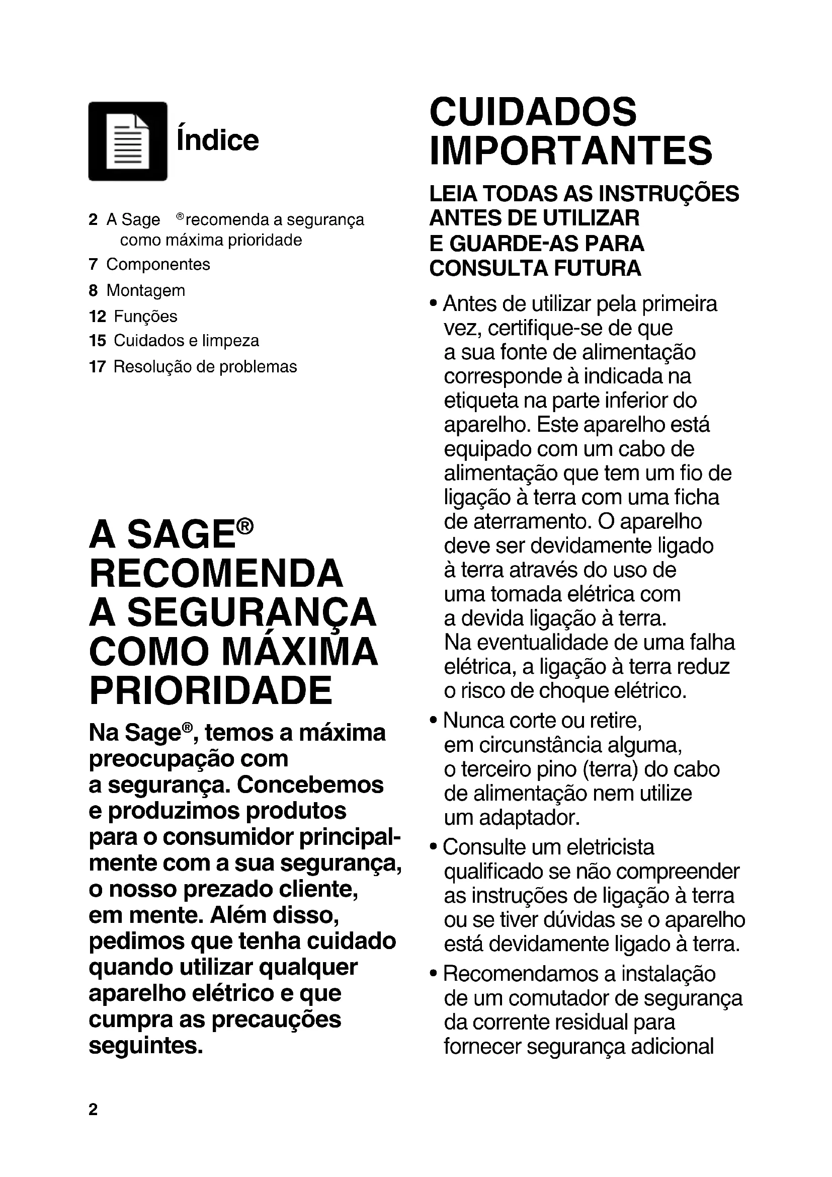 - Recomendamos a instalação de um comutador de segurança da corrente residual para fornecer segurança adicional Índice 2 A Sage recomenda a segurança como máxima prioridade7 Componentes8 Montagem12 Funções15 Cuidados e limpeza17 Resolução de problemas3