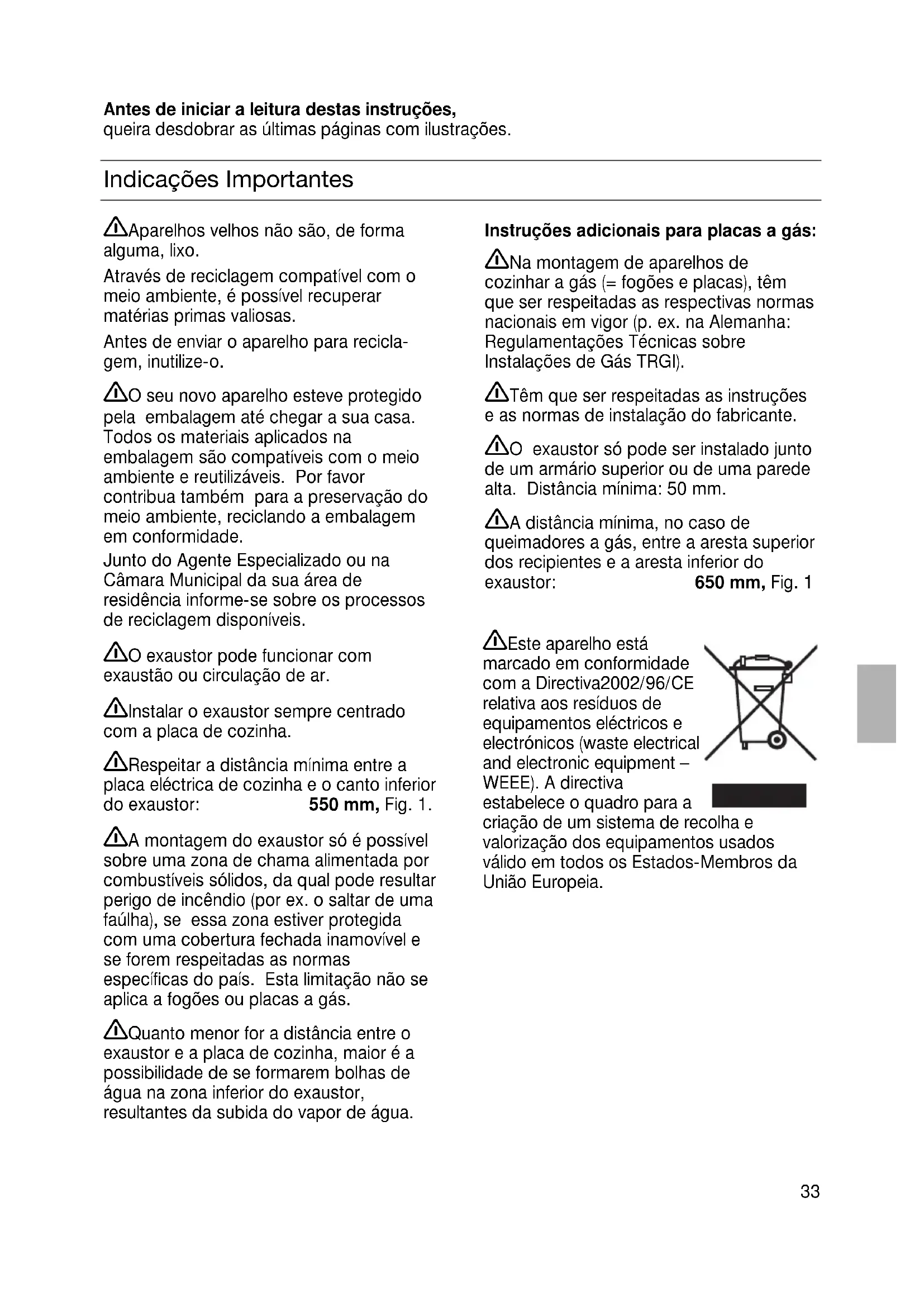Indicações Importantes Instruções adicionais para placas a gás: Na montagem de aparelhos de cozinhar a gás (= fogões e placas), têm que ser respeitadas as respectivas normas nacionais em vigor (p. ex. na Alemanha: Regulamentações Técnicas sobre Instalações de Gás TRGI). Têm que ser respeitadas as instruções e as normas de instalação do fabricante. O exaustor só pode ser instalado junto de um armário superior ou de uma parede alta. Distância mínima: 50 mm. A distância mínima, no caso de queimadores a gás, entre a aresta superior dos recipientes e a aresta inferior do exaustor: 650 mm, Fig. 1 Aparelhos velhos não são, de forma alguma, lixo. Através de reciclagem compatível com o meio ambiente, é possível recuperar matérias primas valiosas. Antes de enviar o aparelho para recicla- gem, inutilize-o. O seu novo aparelho esteve protegido pela embalagem até chegar a sua casa. Todos os materiais aplicados na embalagem são compatíveis com o meio ambiente e reutilizáveis. Por favor contribua também para a preservação do meio ambiente, reciclando a embalagem em conformidade. Junto do Agente Especializado ou na Câmara Municipal da sua área de residência informe-se sobre os processos de reciclagem disponíveis. O exaustor pode funcionar com exaustão ou circulação de ar. Instalar o exaustor sempre centrado com a placa de cozinha. Respeitar a distância mínima entre a placa eléctrica de cozinha e o canto inferior do exaustor: 550 mm, Fig. 1. A montagem do exaustor só é possível sobre uma zona de chama alimentada por combustíveis sólidos, da qual pode resultar perigo de incêndio (por ex. o saltar de uma faúlha), se essa zona estiver protegida com uma cobertura fechada inamovível e se forem respeitadas as normas específicas do país. Esta limitação não se aplica a fogões ou placas a gás. Quanto menor for a distância entre o exaustor e a placa de cozinha, maior é a possibilidade de se formarem bolhas de água na zona inferior do exaustor, resultantes da subida do vapor de água. Antes de iniciar a leitura destas instruções, queira desdobrar as últimas páginas com ilustrações. Este aparelho está marcado em conformidade com a Directiva2002/96/CE relativa aos resíduos de equipamentos eléctricos e electrónicos (waste electrical and electronic equipment – WEEE). A directiva estabelece o quadro para a criação de um sistema de recolha e valorização dos equipamentos usados válido em todos os Estados-Membros da União Europeia.34 Antes da montagem Funcionamento com exaustão Fig. 2 O ar da exaustão é conduzido para cima, através de um canal, ou directamente para o exterior através da parede.