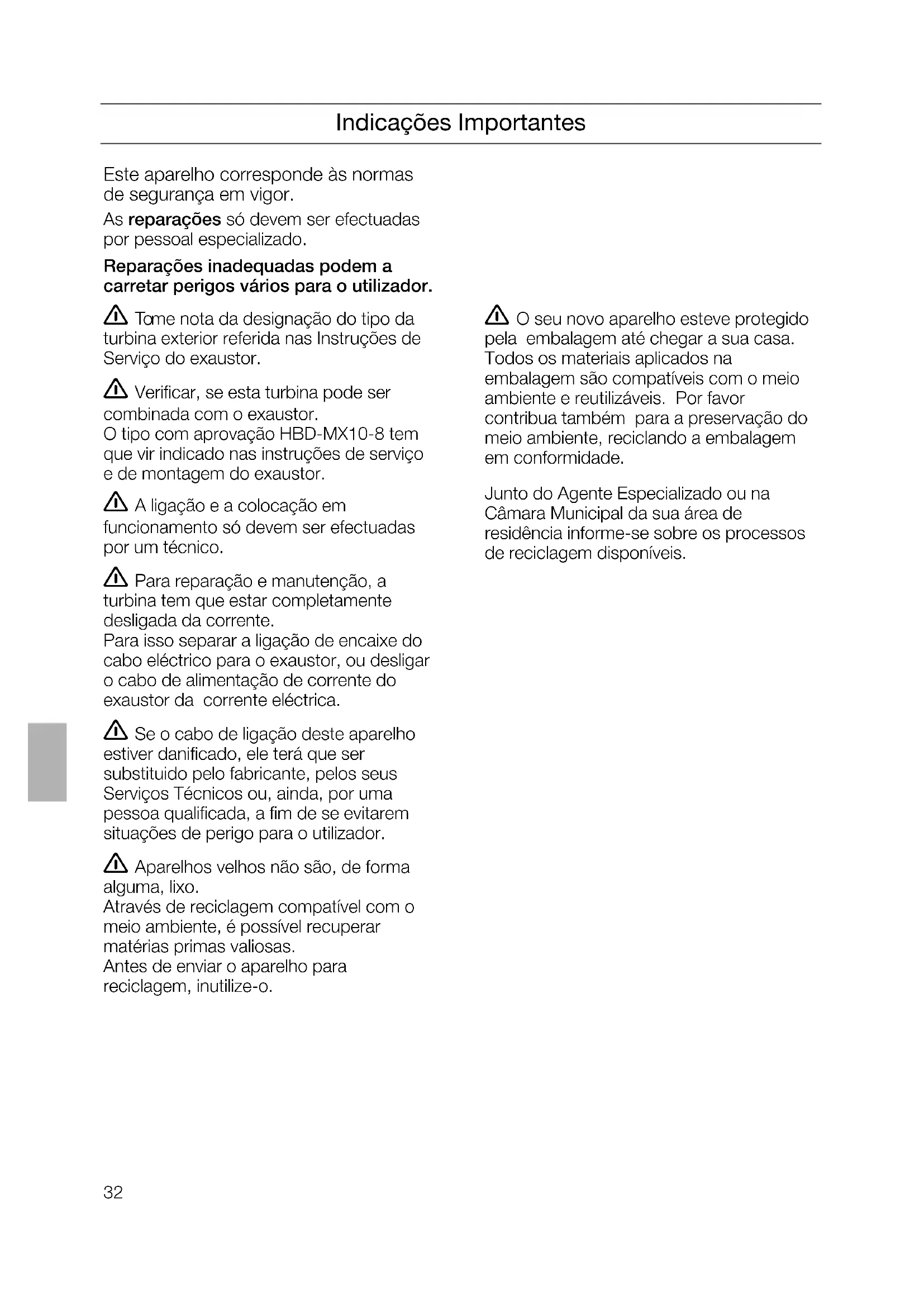 eléctrica con la campana de aspiración. 몇 Por razones de seguridad, el recubrimiento adicional del enchufe deberá permanecer siempre montado y cerrado.32 Indicações Importantes Este aparelho corresponde às normas de segurança em vigor. As reparações só devem ser efectuadas por pessoal especializado. Reparações inadequadas podem a carretar perigos vários para o utilizador. 몇 Tome nota da designação do tipo da turbina exterior referida nas Instruções de Serviço do exaustor. 몇 Verificar, se esta turbina pode ser combinada com o exaustor. O tipo com aprovação HBD-MX10-8 tem que vir indicado nas instruções de serviço e de montagem do exaustor. 몇 A ligação e a colocação em funcionamento só devem ser efectuadas por um técnico. 몇 Para reparação e manutenção, a turbina tem que estar completamente desligada da corrente. Para isso separar a ligação de encaixe do cabo eléctrico para o exaustor, ou desligar o cabo de alimentação de corrente do exaustor da corrente eléctrica. 몇 Se o cabo de ligação deste aparelho estiver danificado, ele terá que ser substituido pelo fabricante, pelos seus Serviços Técnicos ou, ainda, por uma pessoa qualificada, a fim de se evitarem situações de perigo para o utilizador. 몇 Aparelhos velhos não são, de forma alguma, lixo. Através de reciclagem compatível com o meio ambiente, é possível recuperar matérias primas valiosas. Antes de enviar o aparelho para reciclagem, inutilize-o. Este aparelho corresponde às normas de segurança em vigor. As reparações só devem ser efectuadas por pessoal especializado. Reparações inadequadas podem a carretar perigos vários para o utilizador. 몇 O seu novo aparelho esteve protegido pela embalagem até chegar a sua casa. Todos os materiais aplicados na embalagem são compatíveis com o meio ambiente e reutilizáveis. Por favor contribua também para a preservação do meio ambiente, reciclando a embalagem em conformidade. Junto do Agente Especializado ou na Câmara Municipal da sua área de residência informe-se sobre os processos de reciclagem disponíveis.33 Antes da Montagem