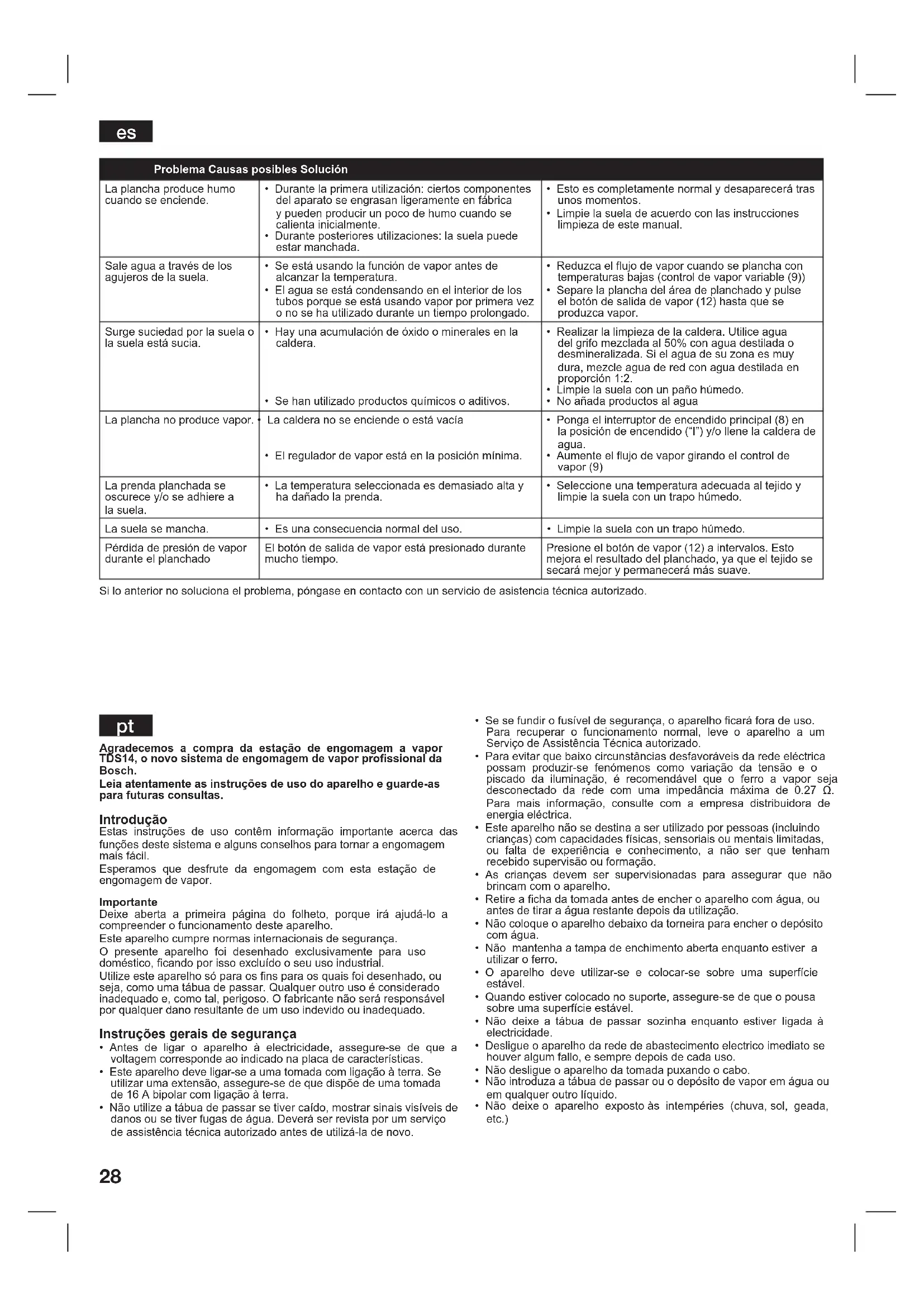 Agradecemos a compra da estação de engomagem a vapor TDS14, o novo sistema de engomagem de vapor prossional da Bosch. Leia atentamente as instruções de uso do aparelho e guarde-as para futuras consultas. Introdução Estas instruções de uso contêm informação importante acerca das funções deste sistema e alguns conselhos para tornar a engomagem mais fácil. Esperamos que desfrute da engomagem com esta estação de engomagem de vapor. Importante Deixe aberta a primeira página do folheto, porque irá ajudá-lo a compreender o funcionamento deste aparelho. Este aparelho cumpre normas internacionais de segurança. O presente aparelho foi desenhado exclusivamente para uso doméstico, cando por isso excluído o seu uso industrial. Utilize este aparelho só para os ns para os quais foi desenhado, ou seja, como uma tábua de passar. Qualquer outro uso é considerado inadequado e, como tal, perigoso. O fabricante não será responsável por qualquer dano resultante de um uso indevido ou inadequado. Instruções gerais de segurança