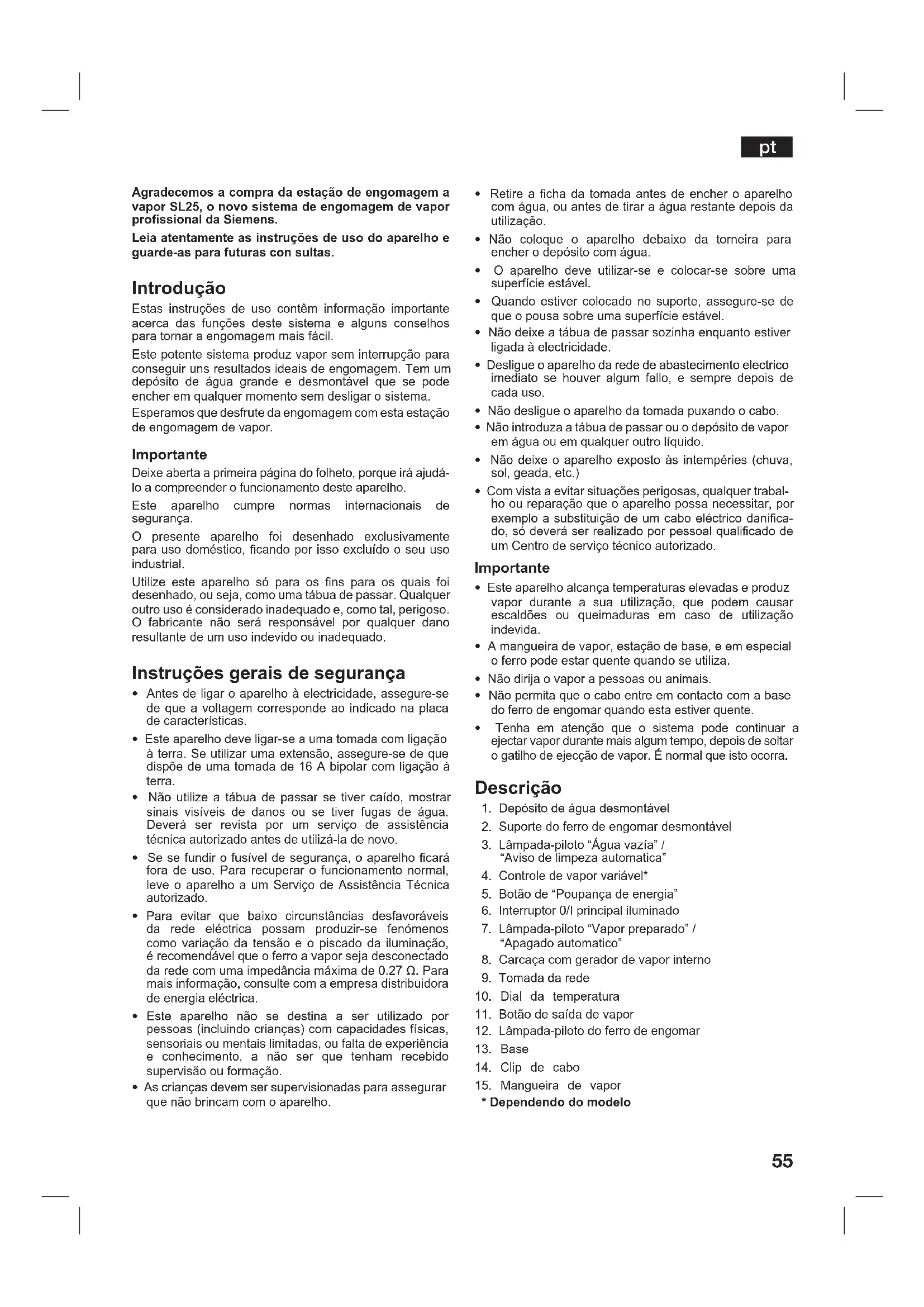 Agradecemos a compra da estação de engomagem a vapor SL25, o novo sistema de engomagem de vapor profissional da Siemens. Leia atentamente as instruções de uso do aparelho e guarde-as para futuras con sultas. Introdução Estas instruções de uso contêm informação importante acerca das funções deste sistema e alguns conselhos para tornar a engomagem mais fácil. Este potente sistema produz vapor sem interrupção para conseguir uns resultados ideais de engomagem. Tem um depósito de água grande e desmontável que se pode encher em qualquer momento sem desligar o sistema. Esperamos que desfrute da engomagem com esta estação de engomagem de vapor. Importante Deixe aberta a primeira página do folheto, porque irá ajudá- lo a compreender o funcionamento deste aparelho. Este aparelho cumpre normas internacionais de segurança. O presente aparelho foi desenhado exclusivamente para uso doméstico, ficando por isso excluído o seu uso industrial. Utilize este aparelho só para os fins para os quais foi desenhado, ou seja, como uma tábua de passar. Qualquer outro uso é considerado inadequado e, como tal, perigoso. O fabricante não será responsável por qualquer dano resultante de um uso indevido ou inadequado. Instruções gerais de segurança