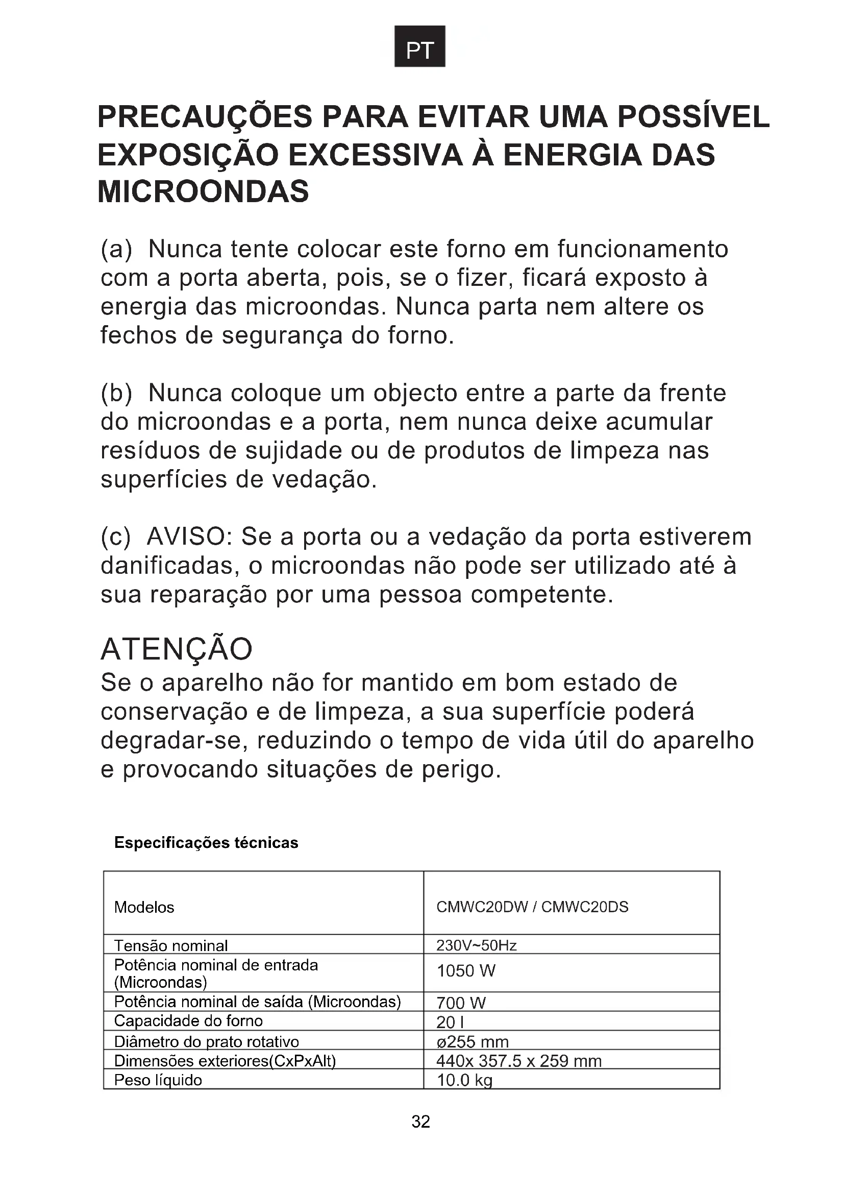 CMWC20DW / CMWC20DS230V~50Hz (a) Nunca tente colocar este forno em funcionamento com a porta aberta, pois, se o fizer, ficará exposto à energia das microondas. Nunca parta nem altere os fechos de segurança do forno. (b) Nunca coloque um objecto entre a parte da frente do microondas e a porta, nem nunca deixe acumular resíduos de sujidade ou de produtos de limpeza nas superfícies de vedação. (c) AVISO: Se a porta ou a vedação da porta estiverem danificadas, o microondas não pode ser utilizado até à sua reparação por uma pessoa competente. ATENÇÃO Se o aparelho não for mantido em bom estado de conservação e de limpeza, a sua superfície poderá degradar-se, reduzindo o tempo de vida útil do aparelho e provocando situações de perigo. PRECAUÇÕES PARA EVITAR UMA POSSÍVEL