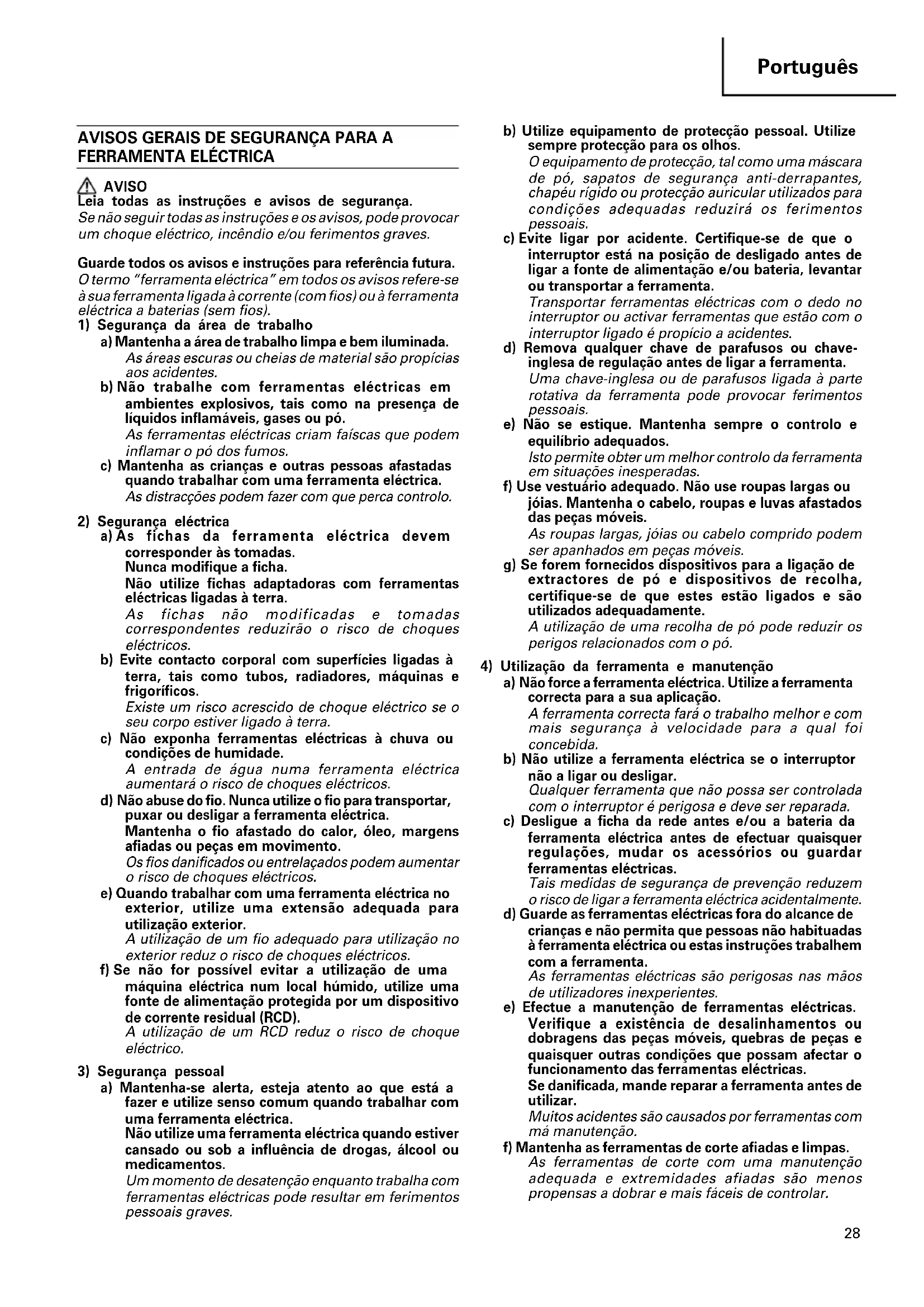 AVISO Leia todas as instruções e avisos de segurança. Se não seguir todas as instruções e os avisos, pode provocar um choque eléctrico, incêndio e/ou ferimentos graves. Guarde todos os avisos e instruções para referência futura. O termo “ferramenta eléctrica” em todos os avisos refere-se à sua ferramenta ligada à corrente (com fios) ou à ferramenta eléctrica a baterias (sem fios).