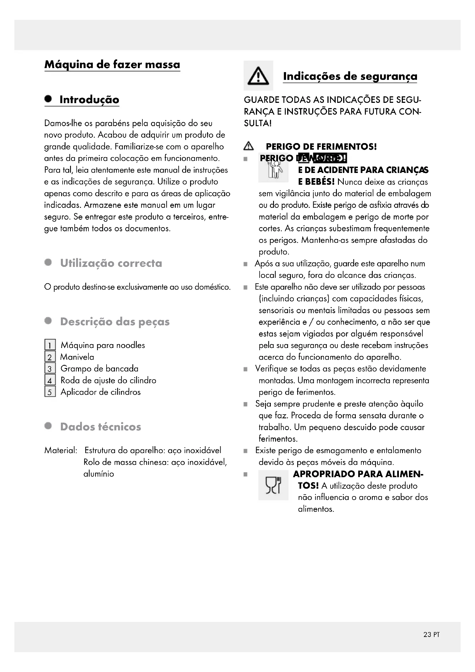 Aplicador de cilindros Dados técnicos Material: Estrutura do aparelho: aço inoxidável Rolo de massa chinesa: aço inoxidável, alumínio Indicações de segurança GUARDE TODAS AS INDICAÇÕES DE SEGU- RANÇA E INSTRUÇÕES PARA FUTURA CON- SULTA! PERIGO DE FERIMENTOS!