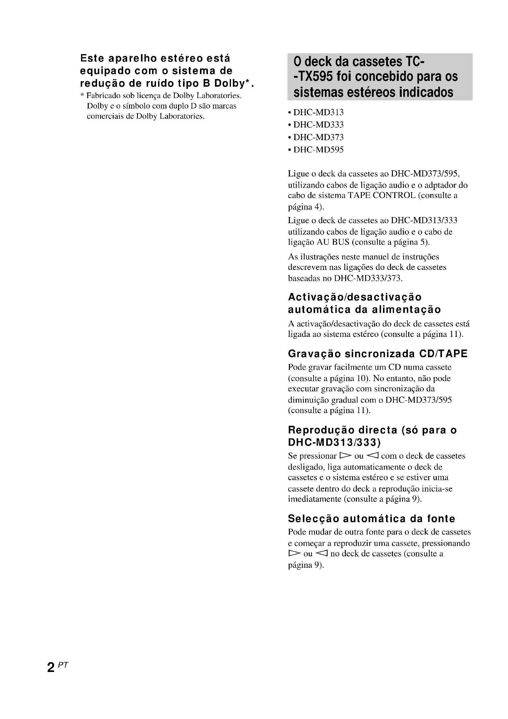 - DHC-MD595 Ligue o deck da cassetes ao DHC-MD373/595, utilizando cabos de ligação audio e o adptador do cabo de sistema TAPE CONTROL (consulte a página 4). Ligue o deck de cassetes ao DHC-MD313/333 utilizando cabos de ligação audio e o cabo de ligação AU BUS (consulte a página 5). As ilustrações neste manuel de instruções descrevem nas ligações do deck de cassetes baseadas no DHC-MD333/373. Activação/desactivação automática da alimentação A activação/desactivação do deck de cassetes está ligada ao sistema estéreo (consulte a página 11). Gravação sincronizada CD/TAPE Pode gravar facilmente um CD numa cassete (consulte a página 10). No entanto, não pode executar gravação com sincronização da diminuição gradual com o DHC-MD373/595 (consulte a página 11). Reprodução directa (só para o DHC-MD313/333) Se pressionar H ou h com o deck de cassetes desligado, liga automaticamente o deck de cassetes e o sistema estéreo e se estiver uma cassete dentro do deck a reprodução inicia-se imediatamente (consulte a página 9). Selecção automática da fonte Pode mudar de outra fonte para o deck de cassetes e começar a reproduzir uma cassete, pressionando H ou h no deck de cassetes (consulte a página 9).3