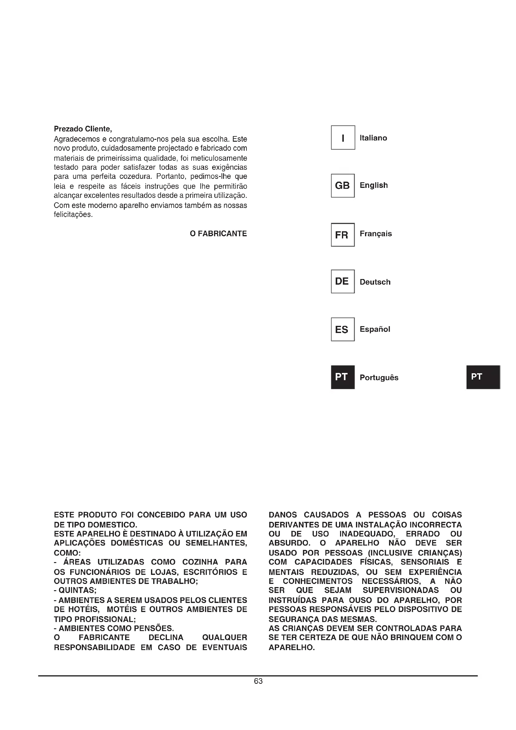 SEGURANÇA DAS MESMAS. AS CRIANÇAS DEVEM SER CONTROLADAS PARA SE TER CERTEZA DE QUE NÃO BRINQUEM COM O APARELHO. Prezado Cliente, Agradecemos e congratulamo-nos pela sua escolha. Este novo produto, cuidadosamente projectado e fabricado com materiais de primeiríssima qualidade, foi meticulosamente testado para poder satisfazer todas as suas exigências para uma perfeita cozedura. Portanto, pedimos-lhe que leia e respeite as fáceis instruções que lhe permitirão alcançar excelentes resultados desde a primeira utilização. Com este moderno aparelho enviamos também as nossas felicitações. O FABRICANTE Italiano