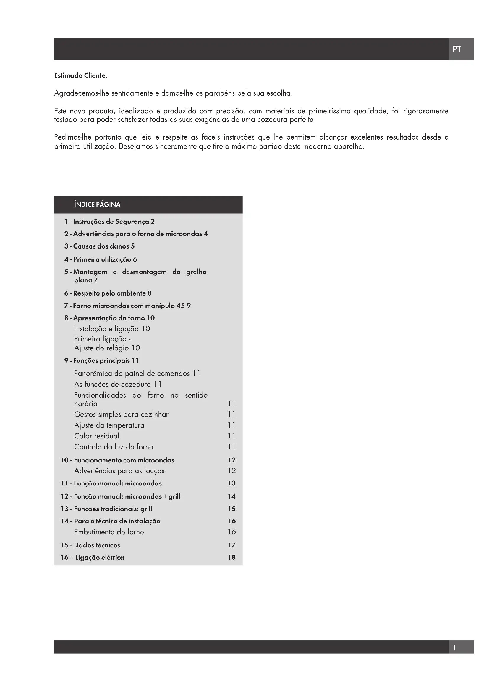 Estimado Cliente, Agradecemos-lhe sentidamente e damos-lhe os parabéns pela sua escolha. Este novo produto, idealizado e produzido com precisão, com materiais de primeiríssima qualidade, foi rigorosamente testado para poder satisfazer todas as suas exigências de uma cozedura perfeita. Pedimos-lhe portanto que leia e respeite as fáceis instruções que lhe permitem alcançar excelentes resultados desde a primeira utilização. Desejamos sinceramente que tire o máximo partido deste moderno aparelho.PT