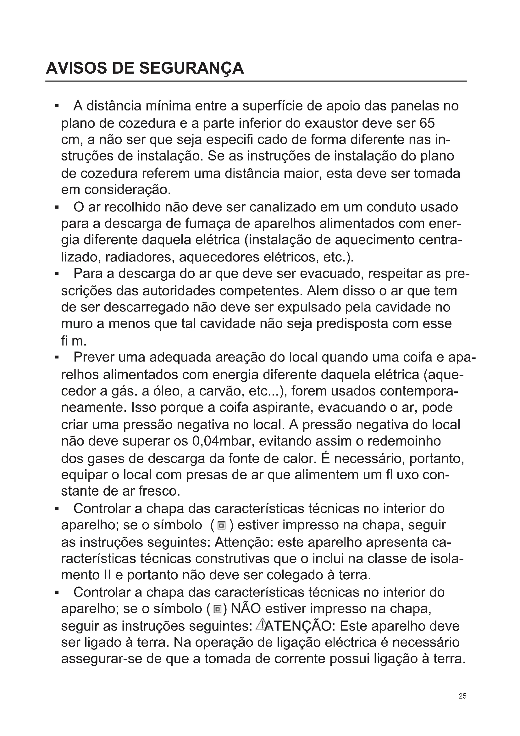 - O ar recolhido não deve ser canalizado em um conduto usado para a descarga de fumaça de aparelhos alimentados com ener- gia diferente daquela elétrica (instalação de aquecimento centra- lizado, radiadores, aquecedores elétricos, etc.).