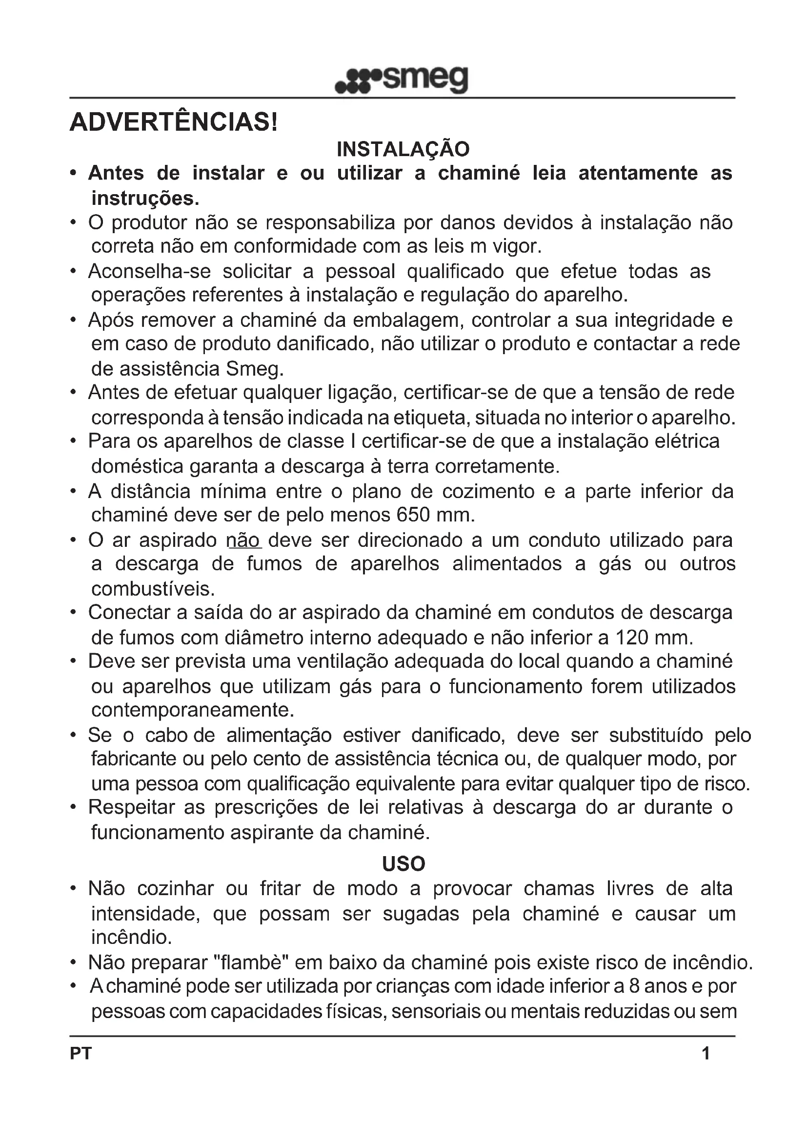 - Após remover a chaminé da embalagem, controlar a sua integridade e em caso de produto danicado, não utilizar o produto e contactar a rede de assistência Smeg.