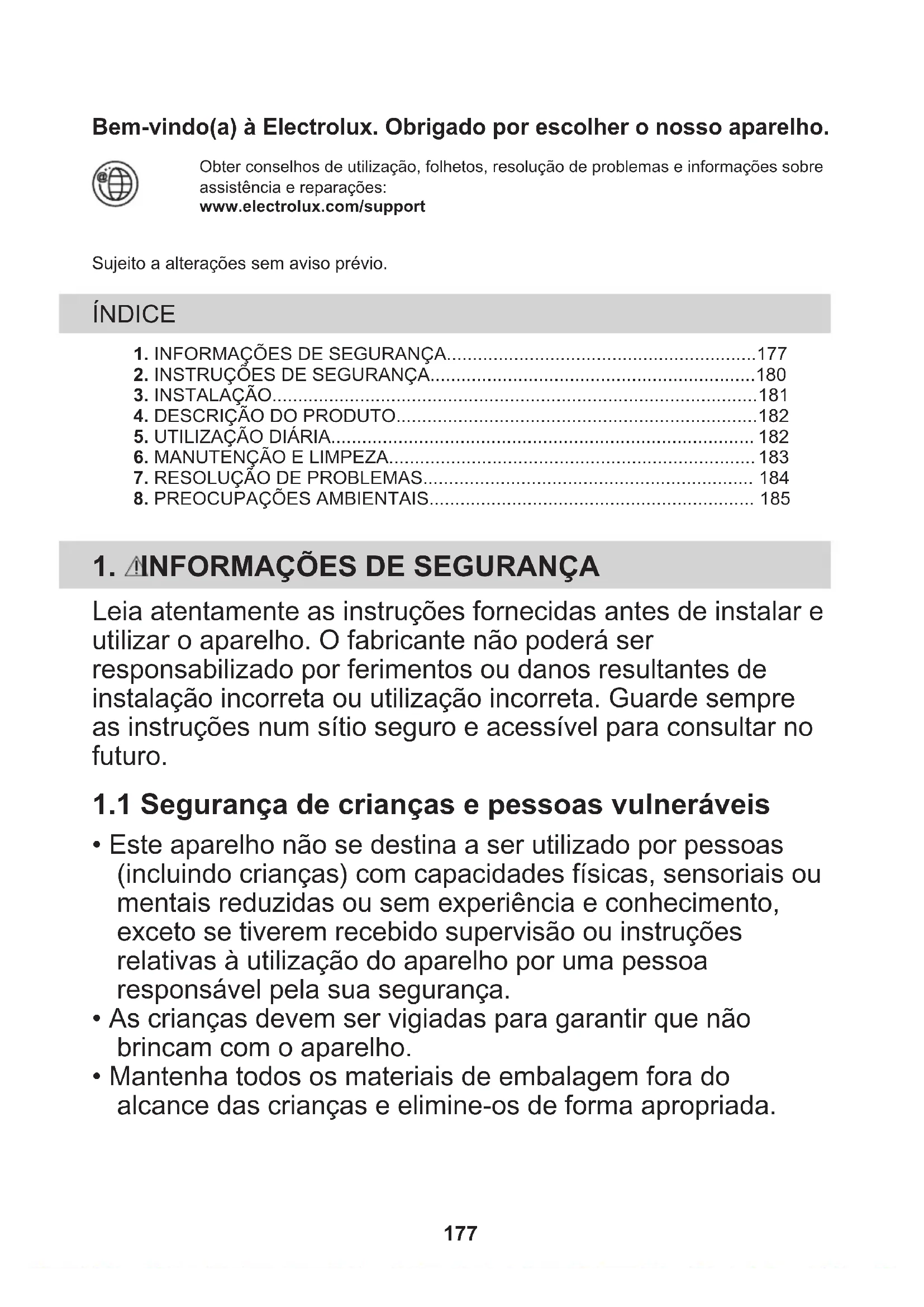 Recicle os materiais que apresentem o símbolo . Coloque a embalagem nos contentores indicados para reciclagem. Ajude a proteger o ambiente e a saúde pública através da reciclagem dos aparelhos eléctricos e electrónicos. Não elimine os aparelhos que tenham o símbolo juntamente com os resíduos domésticos. Coloque o produto num ponto de recolha para reciclagem local ou contacte as suas autoridades municipais. 185Bine aţi venit la Electrolux! Vă mulțumim pentru că ați ales produsul nostru. A găsi sfaturi privind utilizarea, broșuri, informații pentru depanare, service și reparații:www.electrolux.com/supportNe rezervãm dreptul asupra efectuãrii de modificãri. CUPRINS