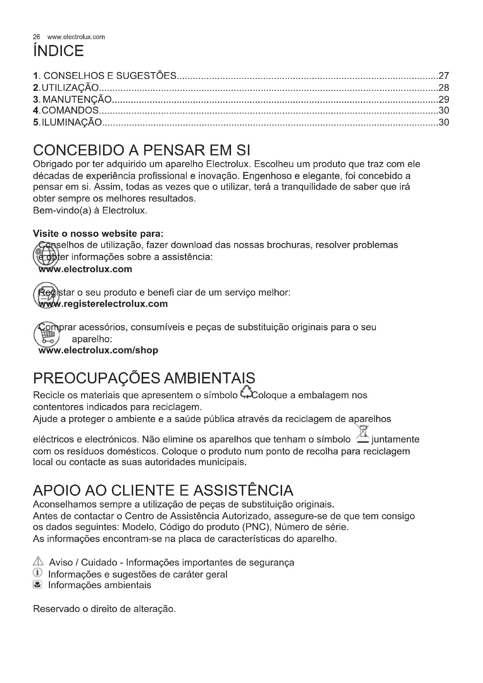 Aconselhamos sempre a utilização de peças de substituição originais. Antes de contactar o Centro de Assistência Autorizado, assegure-se de que tem consigo os dados seguintes: Modelo, Código do produto (PNC), Número de série. As informações encontram-se na placa de características do aparelho. Aviso / Cuidado - Informações importantes de segurança Informações e sugestões de caráter geral Informações ambientais Reservado o direito de alteração.27 PORTUGUÊS
