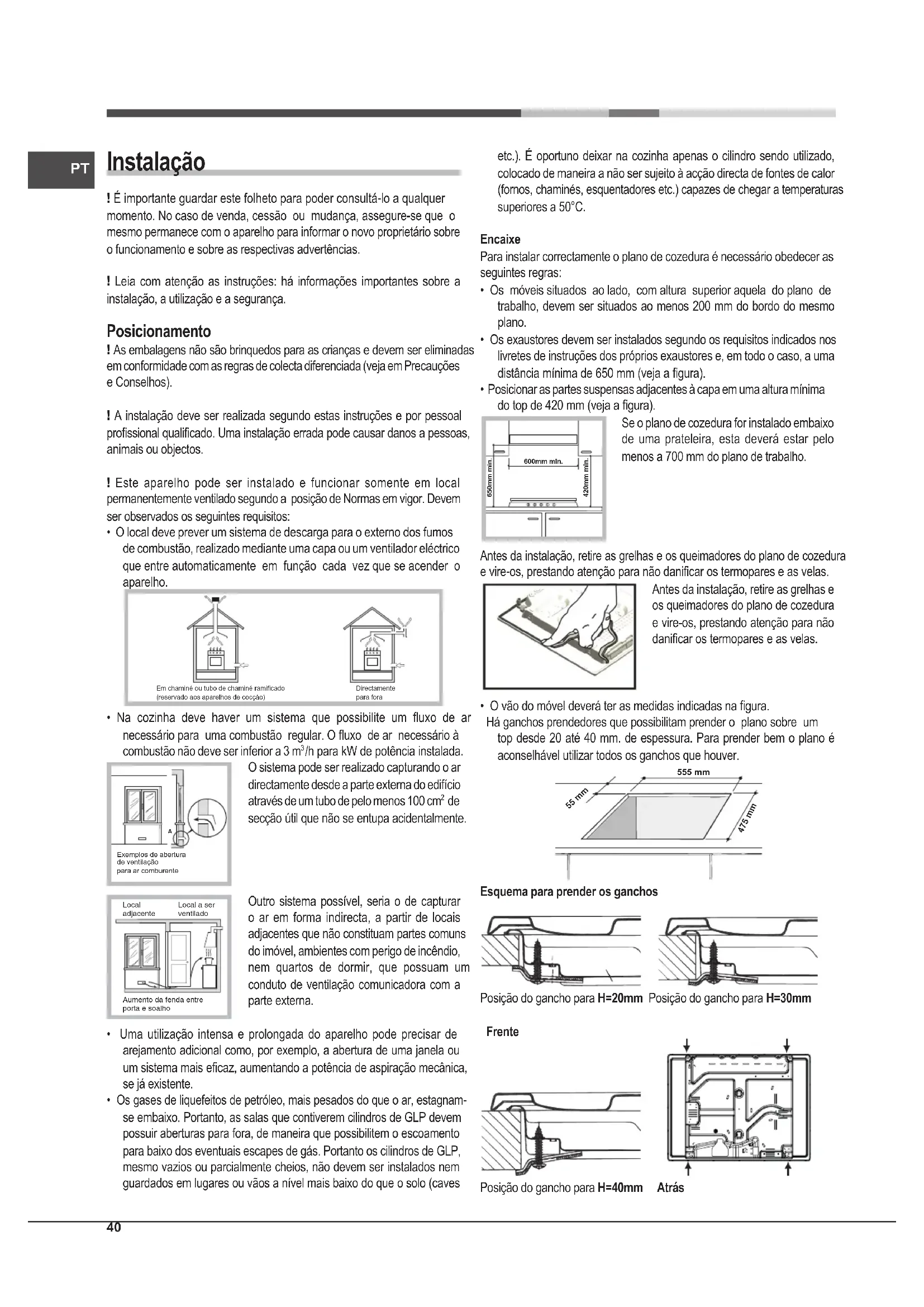 Instalação ! É importante guardar este folheto para poder consultá-lo a qualquer momento. No caso de venda, cessão ou mudança, assegure-se que o mesmo permanece com o aparelho para informar o novo proprietário sobre o funcionamento e sobre as respectivas advertências. ! Leia com atenção as instruções: há informações importantes sobre a instalação, a utilização e a segurança. Posicionamento ! As embalagens não são brinquedos para as crianças e devem ser eliminadas em conformidade com as regras de colecta diferenciada (veja em Precauções e Conselhos). ! A instalação deve ser realizada segundo estas instruções e por pessoal prossional qualicado. Uma instalação errada pode causar danos a pessoas, animais ou objectos. ! Este aparelho pode ser instalado e funcionar somente em local permanentemente ventilado segundo a posição de Normas em vigor. Devem ser observados os seguintes requisitos: