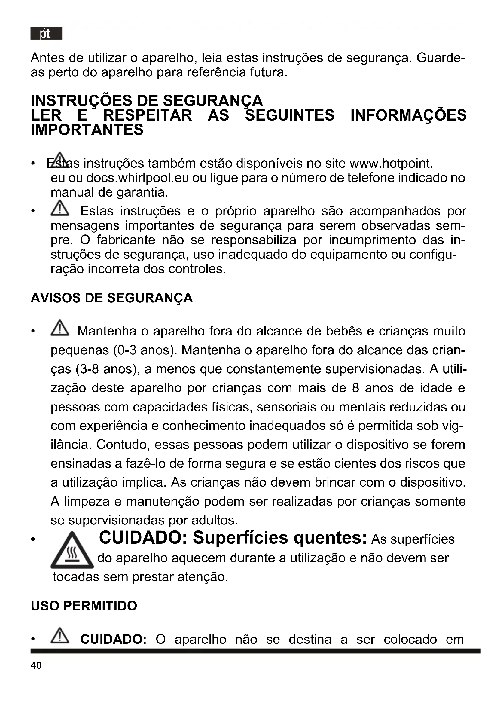 - Estasinstruçõestambémestãodisponíveisnositewww.hotpoint. eu ou docs.whirlpool.eu ou ligue para o número de telefone indicado no manual de garantia.