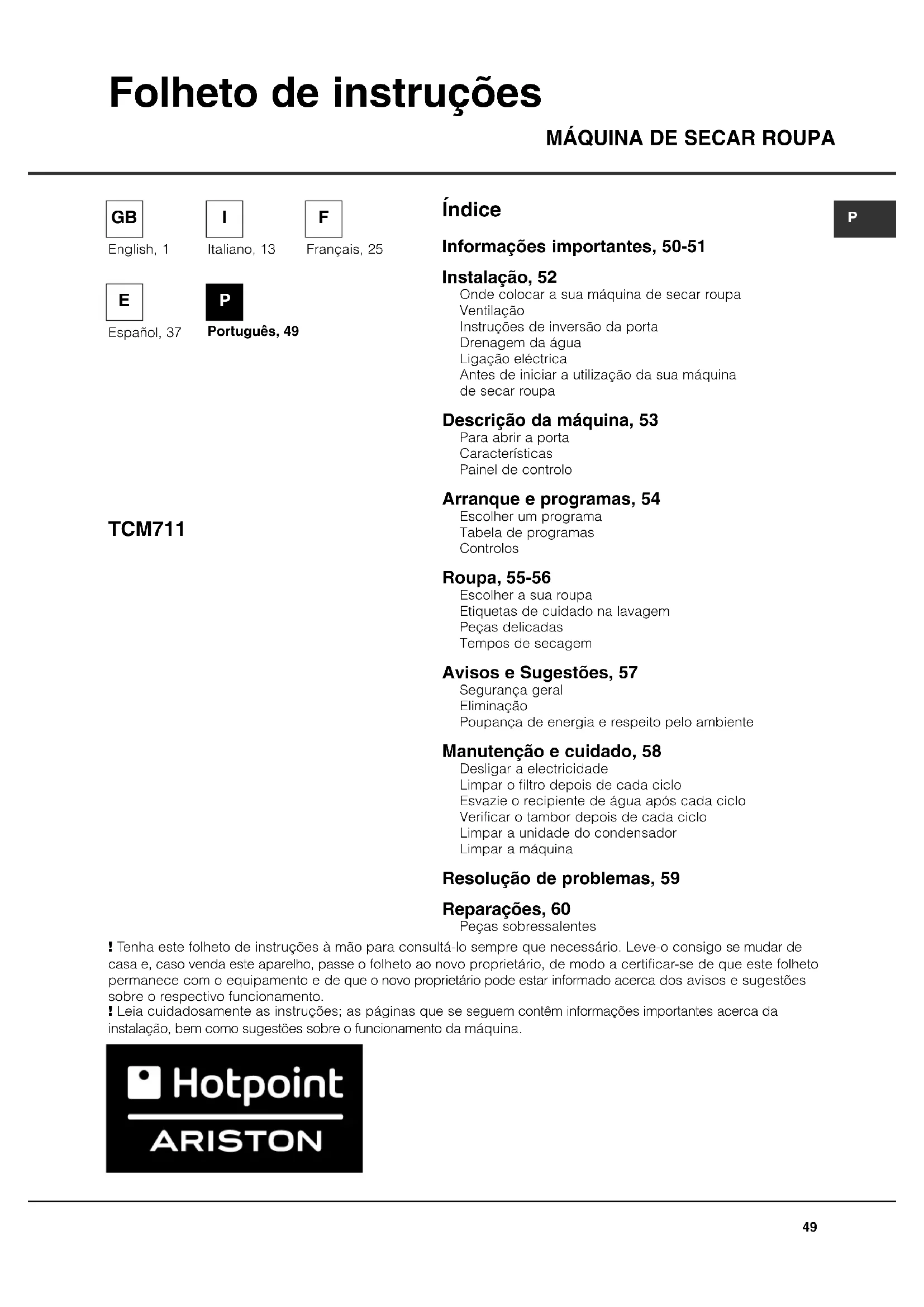 TCM711 Folheto de instruções Informações importantes, 50-51 Instalação, 52 Onde colocar a sua máquina de secar roupa Ventilação Instruções de inversão da porta Drenagem da água Ligação eléctrica Antes de iniciar a utilização da sua máquina de secar roupa Descrição da máquina, 53 Para abrir a porta Características Painel de controlo Arranque e programas, 54 Escolher um programa Tabela de programas Controlos Roupa, 55-56 Escolher a sua roupa Etiquetas de cuidado na lavagem Peças delicadas Tempos de secagem Avisos e Sugestões, 57 Segurança geral Eliminação Poupança de energia e respeito pelo ambiente Manutenção e cuidado, 58 Desligar a electricidade Limpar o filtro depois de cada ciclo Esvazie o recipiente de água após cada ciclo Verificar o tambor depois de cada ciclo Limpar a unidade do condensador Limpar a máquina Resolução de problemas, 59 Reparações, 60 Peças sobressalentes