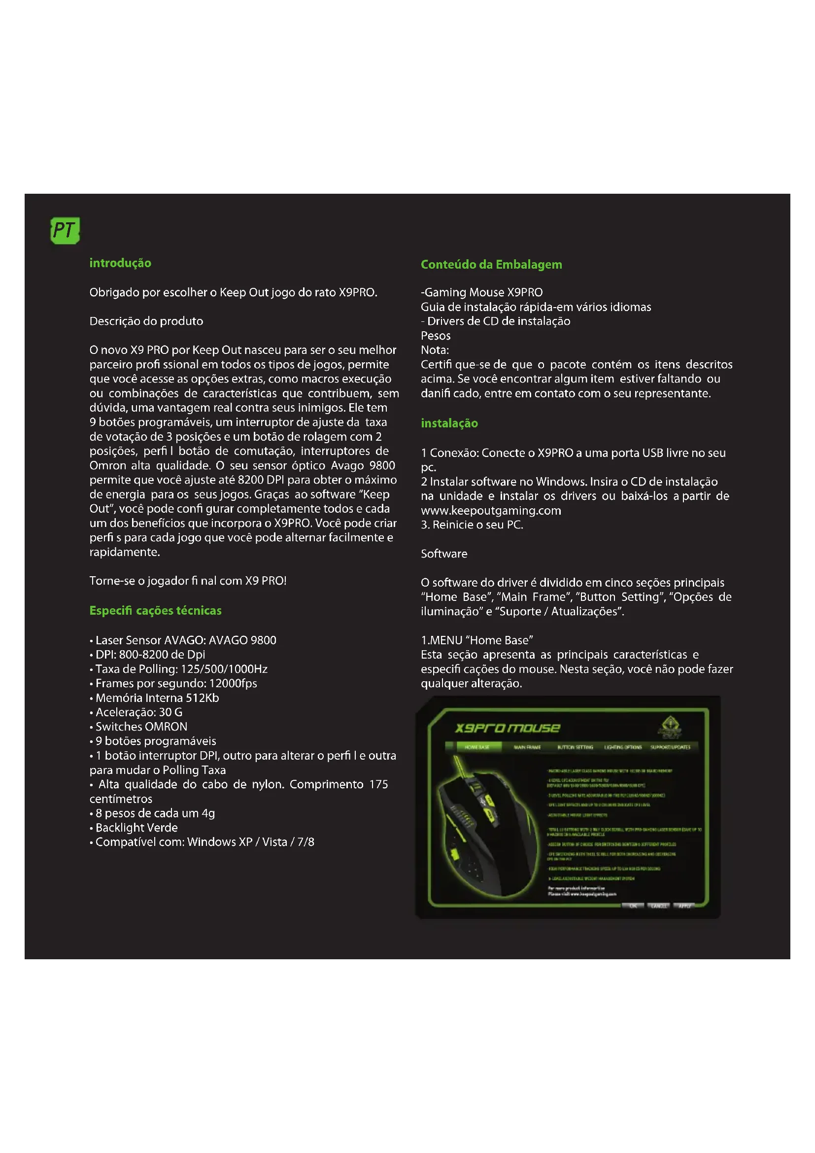 Tutaj nie możemy nic skongurować, możesz odwiedzić naszą stronę internetową, gdzie można pobrać najnowsze sterowniki lub konsultacji, jeśli masz jakiekolwiek pytania. Wsparcie techniczne Aby uzyskać więcej informacji na temat instalowania i kongurowania tego produktu na naszej stronie internetowej www.keepoutgaming.com lub napisać e-maila na adres: support@keep-out.euPT introdução Obrigado por escolher o Keep Out jogo do rato X9PRO. Descrição do produto O novo X9 PRO por Keep Out nasceu para ser o seu melhor parceiro pro ssional em todos os tipos de jogos, permite que você acesse as opções extras, como macros execução ou combinações de características que contribuem, sem dúvida, uma vantagem real contra seus inimigos. Ele tem 9 botões programáveis, um interruptor de ajuste da taxa de votação de 3 posições e um botão de rolagem com 2 posições, per l botão de comutação, interruptores de Omron alta qualidade. O seu sensor óptico Avago 9800 permite que você ajuste até 8200 DPI para obter o máximo de energia para os seus jogos. Graças ao software “Keep Out”, você pode con gurar completamente todos e cada um dos benefícios que incorpora o X9PRO. Você pode criar per s para cada jogo que você pode alternar facilmente e rapidamente. Torne-se o jogador nal com X9 PRO! Especi cações técnicas