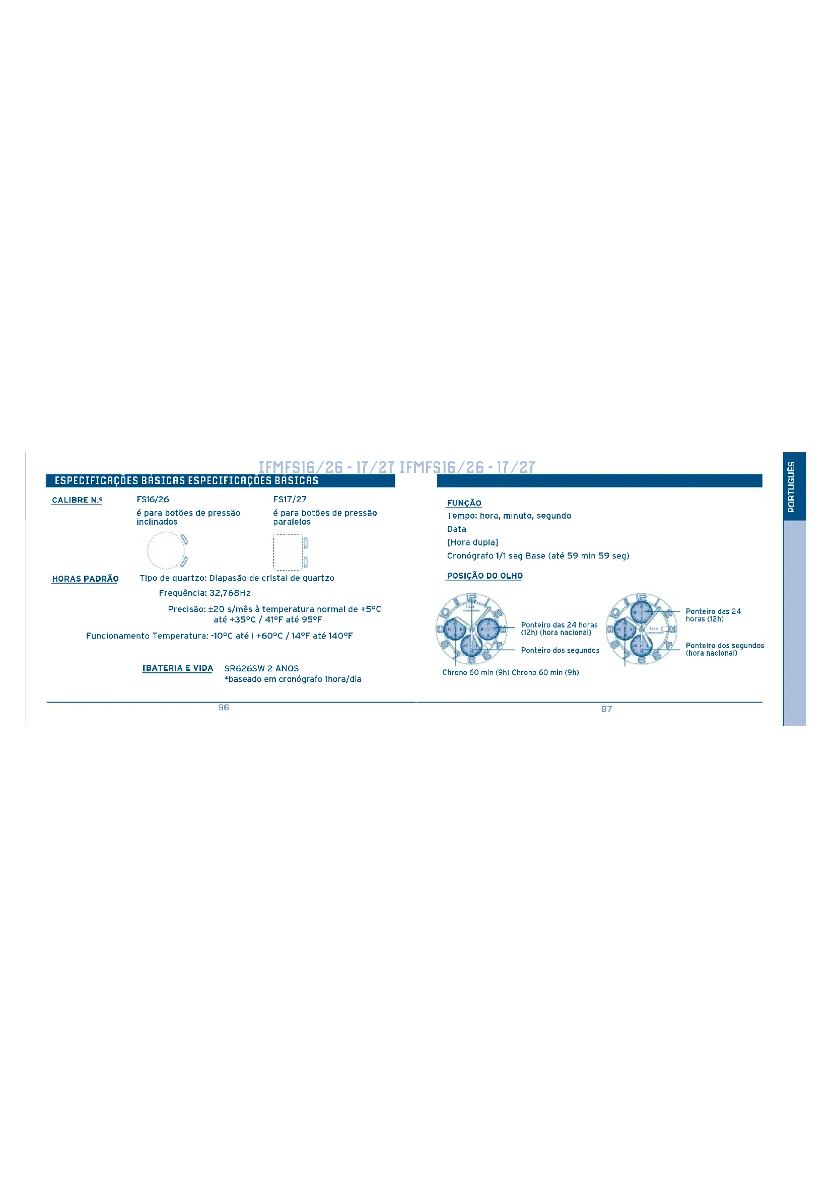 PORTUGUÊS ESPECIFICAÇÕES BÁSICAS ESPECIFICAÇÕES BÁSICAS FS16/26 é para botões de pressão inclinados FS17/27 é para botões de pressão paralelos FUNÇÃO Tempo: hora, minuto, segundo Data [Hora dupla] Cronógrafo 1/1 seg Base (até 59 min 59 seg)