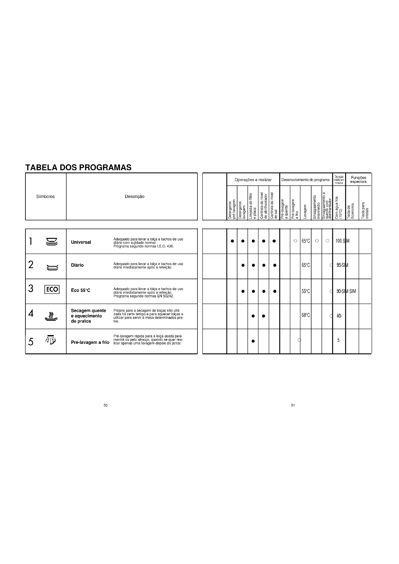 UniversalDiárioEco 55°CSecagem quentee aquecimentode pratosPré-lavagem a frioOperações a realizar Desenvolvimento do programaDuraçãomédia emminutosFunçõesespeciaisDetergente pré-lavagemDetergente lavagemLimpeza do filtro e placaControlo do nível de abrilhantadorControlo do nível de salPré-lavagem a quentePré-lavagema frioLavagemEnxaguamentointermédioEnxaguamento aquente comabrilhantadorCom água fría (15°C)Tecla deEconomiaTecla para cristaisAdequado para lavar a loiça e tachos de usodiário com sujidade normal.Programa segundo normas I.E.C. 436.Adequado para lavar a loiça e tachos de usodiário imediatamente após a refeição.Adequado para lavar a loiça e tachos de usodiário imediatamente após a refeição.Programa segundo normas EN 50242.Próprio para a secagem de loiças não utili-zada há certo tempo e para aquecer loiças autilizar para servir à mesa determinados pra- tos. Pré-lavagem rápida para a loiça usada pelamanhã ou pelo almoço, quando se quer rea-lizar apenas uma lavagem depois do jantar. ECOAtenção Esta máquina está equipada com um dispositivo de seguranca contra inundações que é activado mesmo que a máquina esteja desligada e que interrompe automaticamente o fluxo de água se, devido a uma possível avaria, a água ultra- passar o nível normal. Importante A fim de evitar que o dispositivo de segurança contra inundações seja inoportunamente activa- do, recomenda-se que a máquina não seja deslo- cada ou inclinada enquanto estiver a funcionar. Se for absolutamente necessário deslocar ou inclinar a máquina enquanto esta estiver a fun- cionar, assegure-se primeiro de que o ciclo de lavagem já terminou e que não há água na cuba da máquina. Selecção de programas e funções especiais Para seleccionar os programas, deverá rodar o botão de selecção dos programas no sentido dos ponteiros do relógio até o respectivo símbolo coincidir com a marca e carregar então na tecla de ligar/desligar. Assegure-se de que a torneira da água esteja aberta e a porta bem fechada. Tecla de economia A tecla de economia “ ” reduz a fase de aquecimento final da água durante o último enxaguamento. É assim activado um processo de secagem natural da loiça, semelhante ao que tem lugar quando a loiça fica a secar nos escorredouros normais, para o que bastará abrir a porta no fim do ciclo de lavagem para favorecer a circulação natural do ar. Esta tecla de economia “ ” permite poupar mais de 20% de energia e reduz a duração do ciclo de lavagem. Trata-se de uma função parti- cularmente recomendada para a lavagem da loiça ao fim do dia, quando não se pretenda descarregar logo da máquina uma loiça perfeita- mente seca. Tecla para cristais Se, uma vez seleccionado o programa de lavagem 3 (delicado), se premir esta tecla, a máquina lava a loiça a 45° C. Esta função é especialmente recomendada para a lavagem de cristais e de vidros delicados. Fim de programa O programa termina quando o botão de selecção de programas avança até ao símbolo 0. Pressione então a tecla para desligar a sua máquina da corrente e só depois abra a porta da máquina.